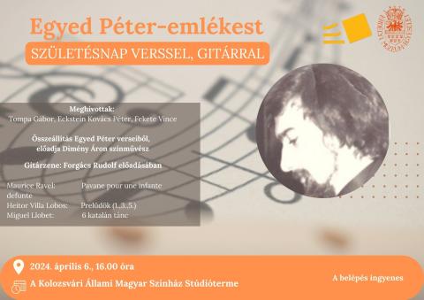 A Kolozsvári Állami Magyar Színház és az Erdélyi Múzeum-Egyesület 2024. április 6-án, 16.00 órától a színház stúdiótermében Egyed Péter-emlékestet szervez.