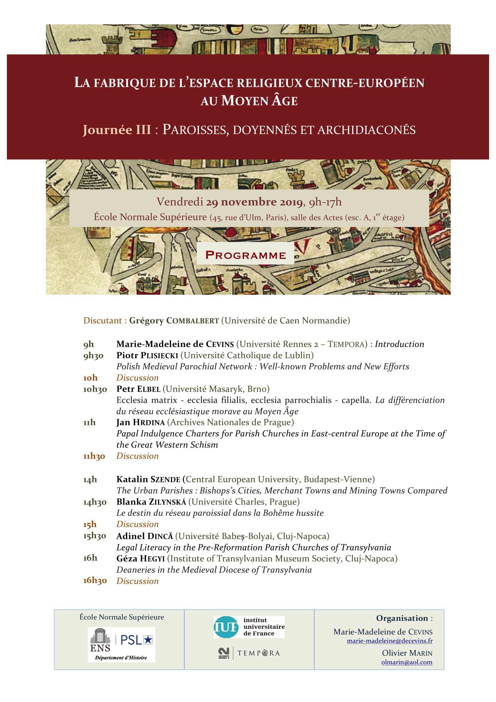 2019. november 29-én a párizsi École Normale Supérieure falai között Paroisses, doyennés et archidiaconés (Plébániák, esperességek és főesperességek) címmel egyháztörténeti műhelykonferenciára került sor Marie-Madeleine de Cevins (Université de Rennes 2) szervezésében, egy - általa kezdeményezett - konferenciasorozat (La fabrique de l'espace religieux centre-européen au Moyen Âge [A közép-európai középkori egyházi térszerkezet kialakulása]) harmadik ülésszakaként.
