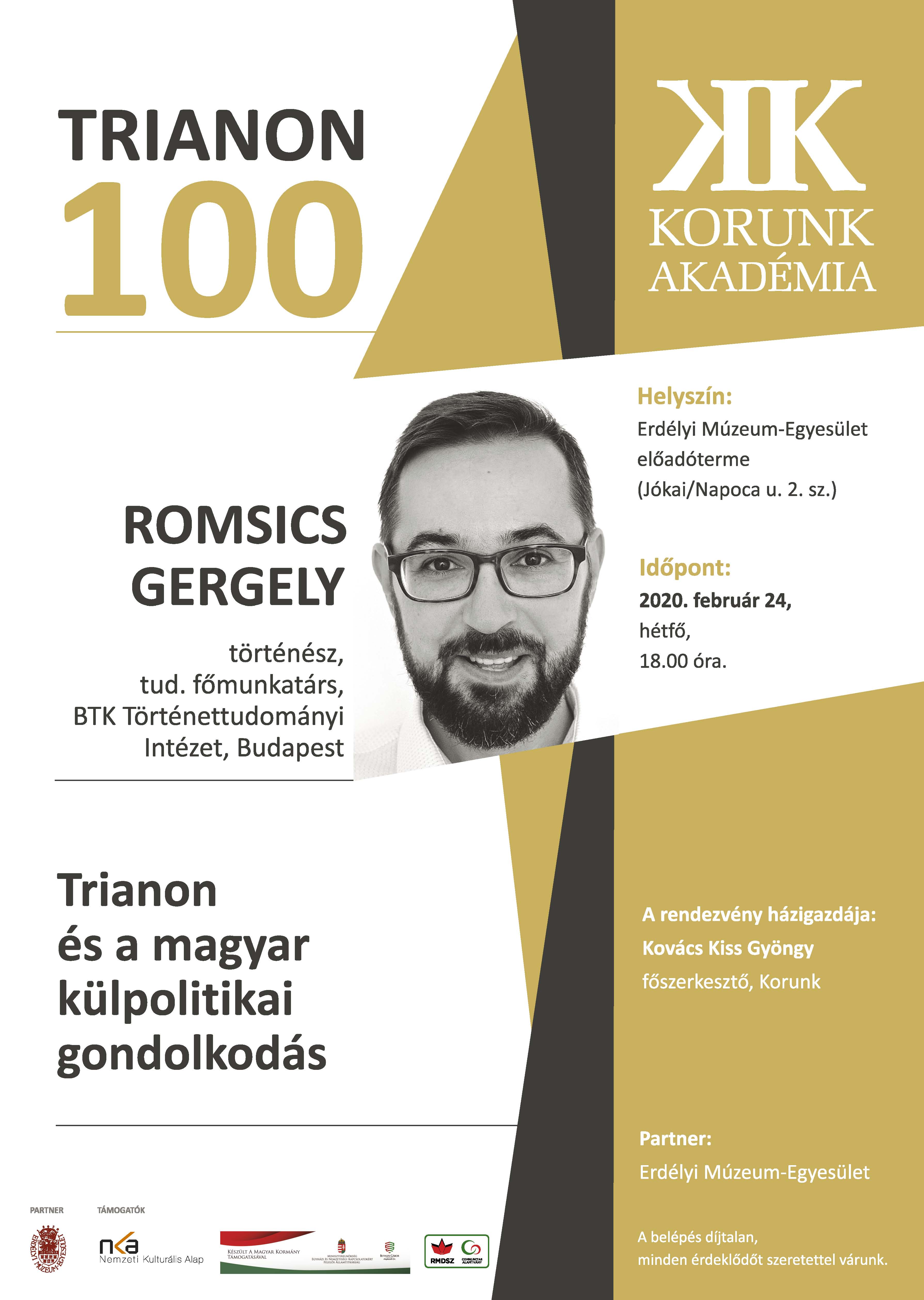 Meghívott előadó: Romsics Gergely történész, tudományos főmunkatárs, BTK Történettudományi Intézet, Budapest. Az előadásra 2020. február 24-én, hétfőn 18 órától kerül sor az Erdélyi Múzeum-Egyesület előadótermében.