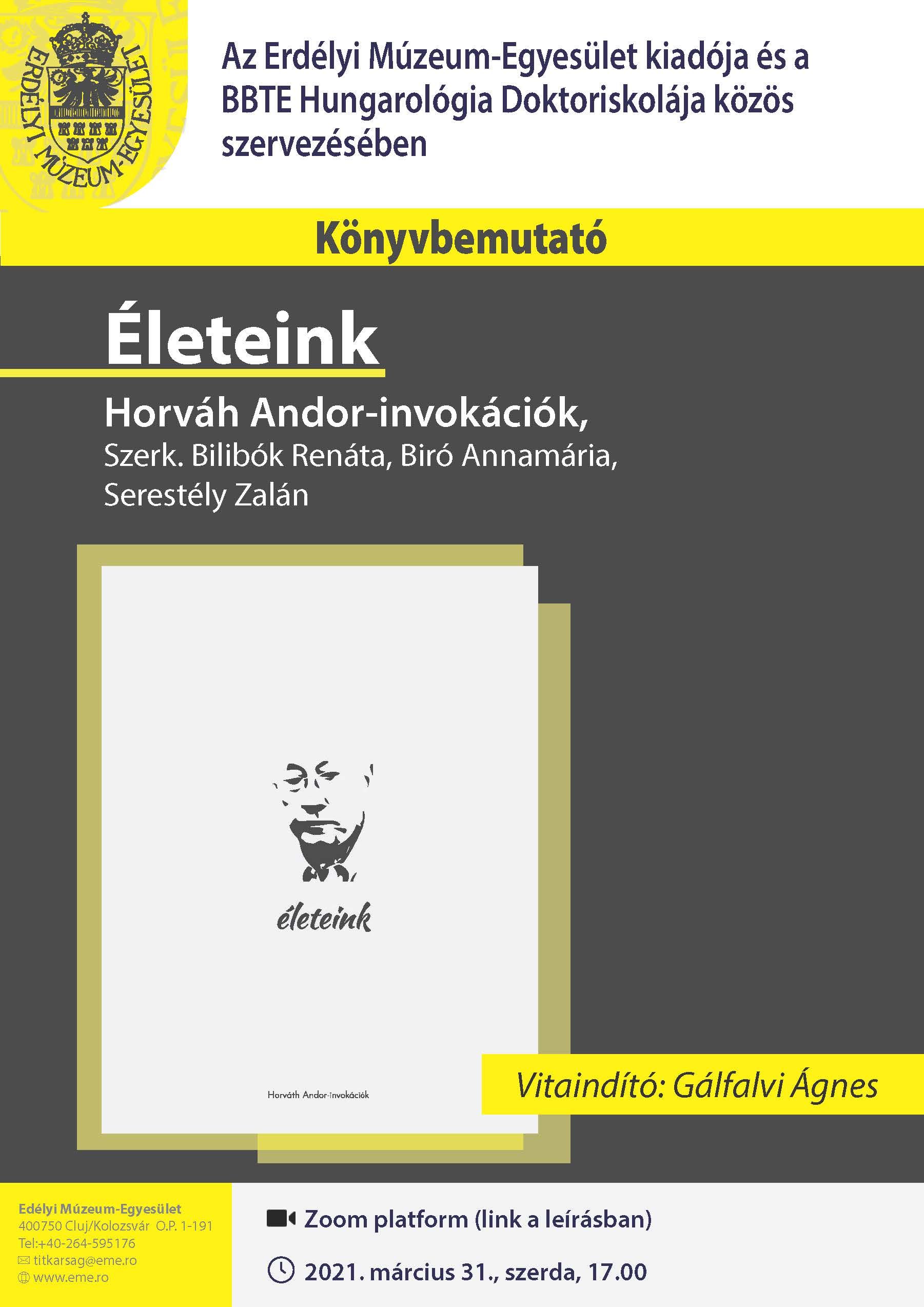 2021. március 31.: Életeink. Horváh Andor-invokációk, Szerk. Bilibók Renáta, Biró Annamária, Serestély Zalán, EME, 2020. (Vitaindító: Gálfalvi Ágnes doktorandusz)