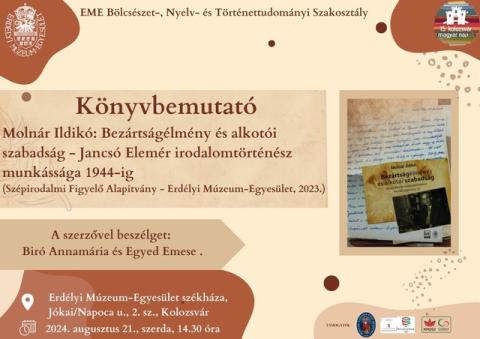 Jancsó Elemér (1905-1971) kolozsvári irodalomtudós munkásságáról ez az első monográfia. A könyv létrejöttéről, forrásokról, kutatási eredményekről és problémákról beszélgetnek a szerzővel Molnár Ildikóval Biró Annamária és Egyed Emese irodalomtörténészek.