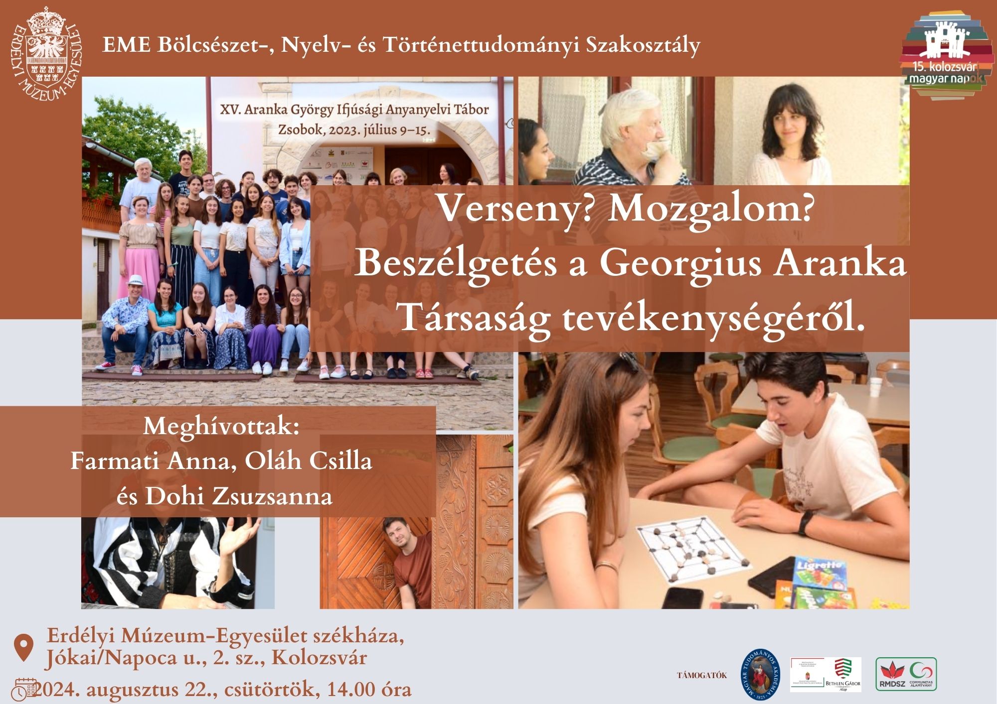 Az EME Bölcsészet-, Nyelv- és Történettudományi Szakosztálya a 15. Kolozsvári Magyar Napok keretén belül beszélgetést szervez a Georgius Aranka Társaság tevékenységéről augusztus 22-én, 14 órától, az EME székházának előadótermében.