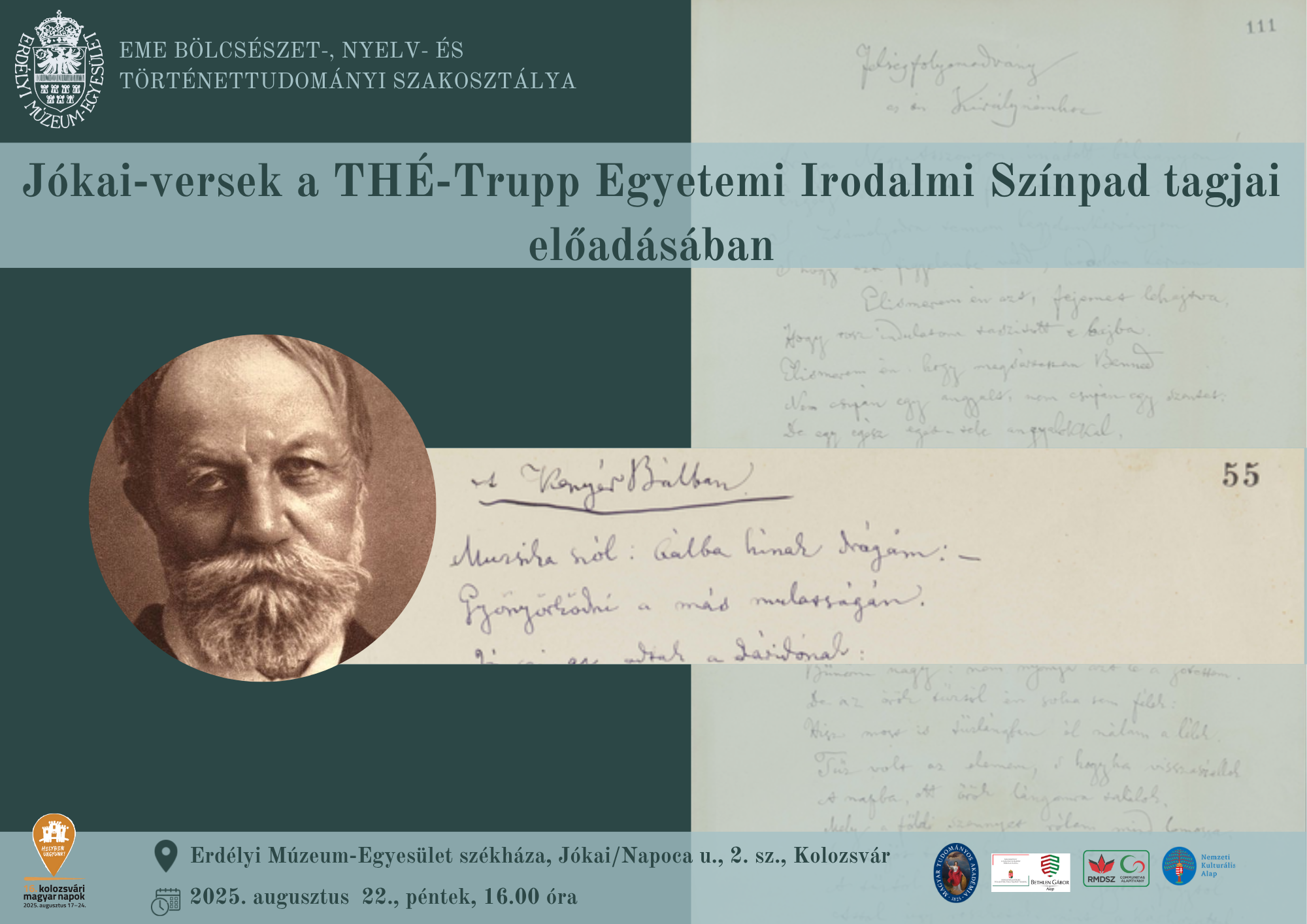 Az Erdélyi Múzeum-Egyesület Bölcsészet-, Nyelv- és Történettudományi Szakosztályának szervezésében 2025. augusztus 22-én, pénteken 16:00 és 17:00 óra között kerül sor egy különleges irodalmi előadásra az EME székház előadótermében (Kolozsvár, Napoca/Jókai utca 2, I. emelet).