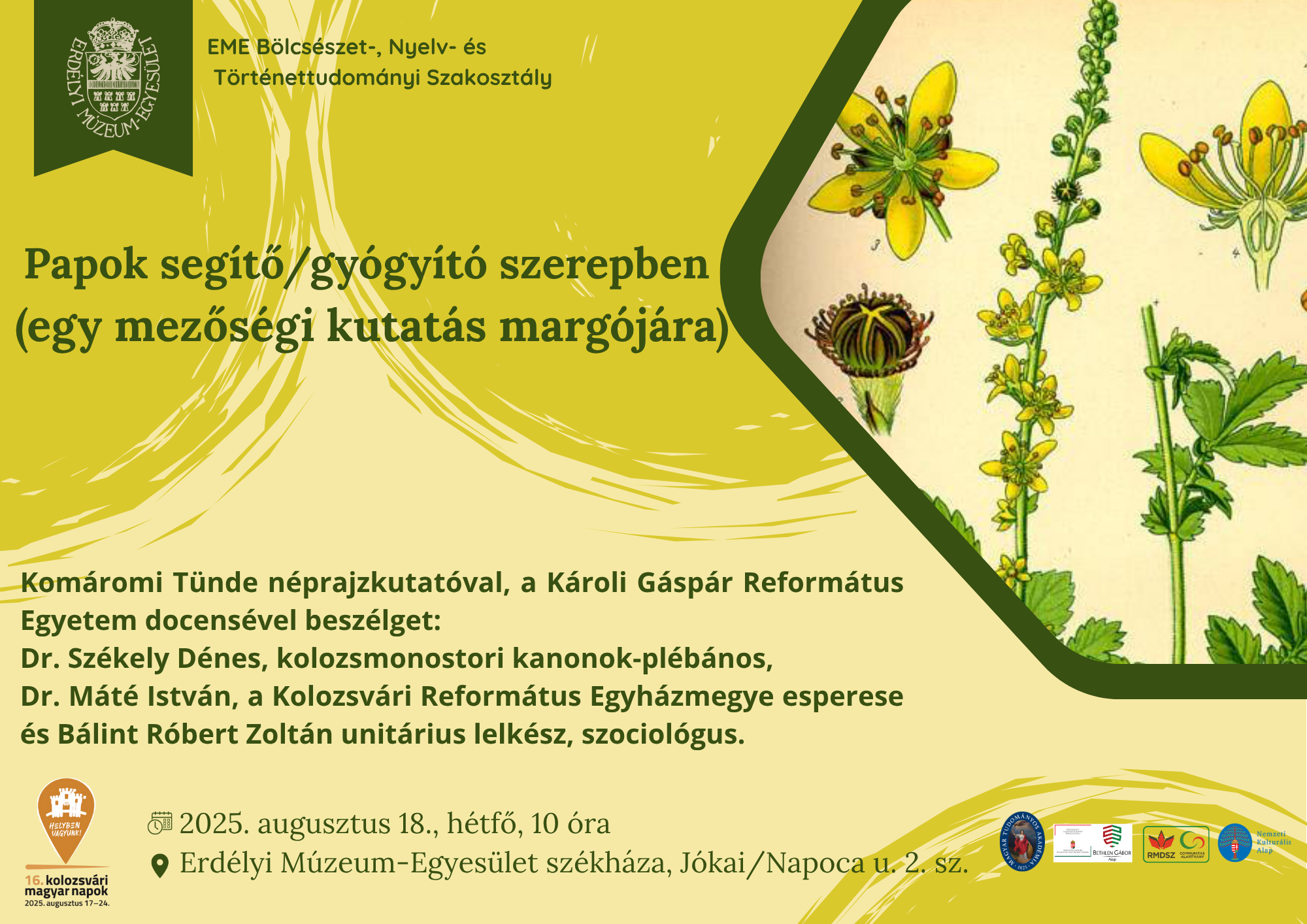 Az Erdélyi Múzeum-Egyesület Bölcsészet-, Nyelv- és Történettudományi Szakosztályának szervezésében augusztus 18-án, hétfőn 10:00 és 11:30 között kerül sor a „Papok segítő/gyógyító szerepben (egy mezőségi kutatás margójára)” című eseményre az EME székházában. A program során Komáromi Tünde néprajzkutató, a Károli Gáspár Református Egyetem docense, a Babeș–Bolyai Tudományegyetem néprajz szakának végzettje és a Román Akadémia kolozsvári Folklór Archívumának korábbi munkatársa mezőségi kutatásai alapján beszélget meghívottaival a krízishelyzetekhez fűződő hiedelmekről, a megoldási gyakorlatokról, valamint a lelkészek gyógyítói és segítői szerepéről. Beszélgetőtársak: Dr. Székely Dénes, kolozsmonostori kanonok-plébános, Dr. Máté István, a Kolozsvári Református Egyházmegye esperese és Bálint Róbert Zoltán unitárius lelkész, szociológus.