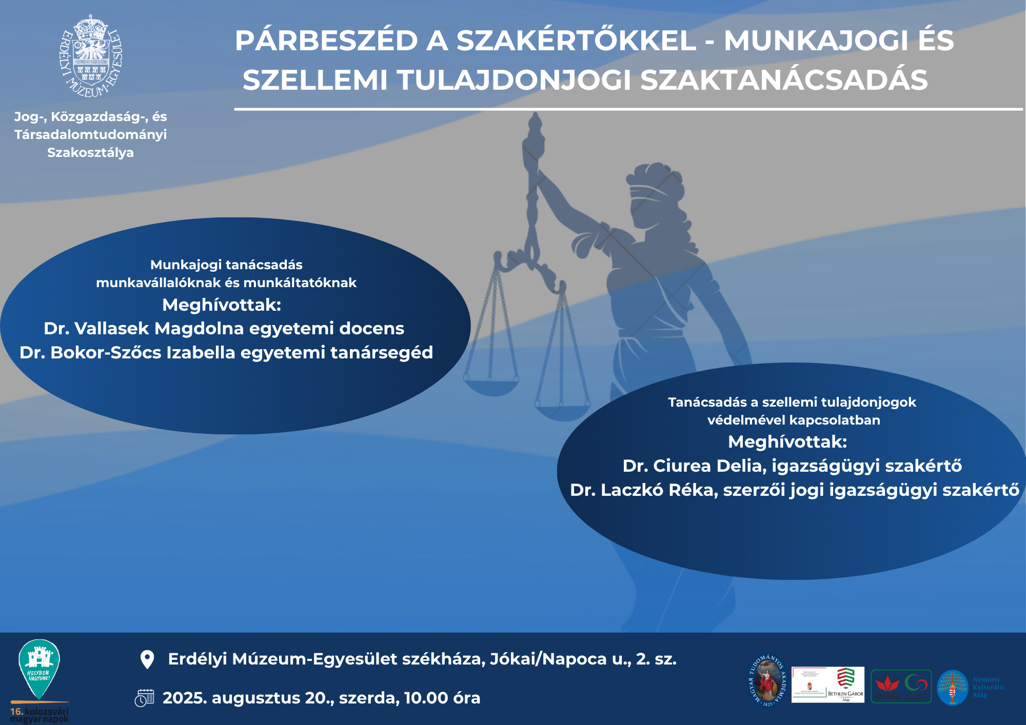 Augusztus 20-án, szerdán 10:00 és 11:30 óra között kerül sor a „Párbeszéd a szakértőkkel – munkajogi és szellemi tulajdonjogi szaktanácsadás” című eseményre az EME-székházban. A rendezvényt az Erdélyi Múzeum-Egyesület Jog-, Közgazdaság-, és Társadalomtudományi Szakosztálya szervezi, és célja, hogy gyakorlati útmutatást nyújtson a jogi kérdések iránt érdeklődő közönség számára.