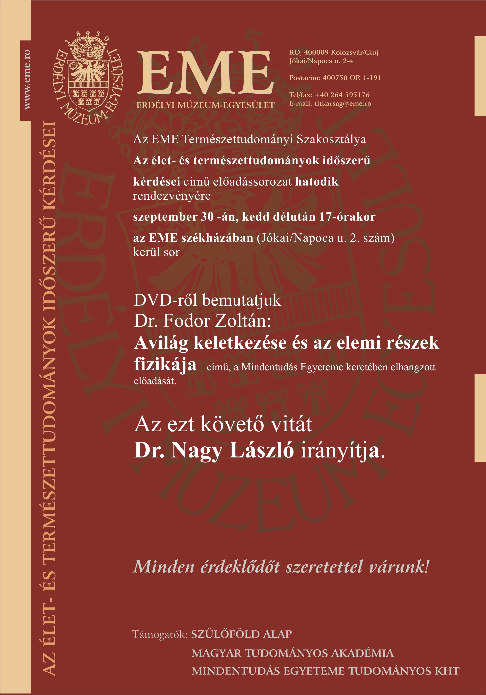 Az élet- és természettudományok időszerű kérdései című előadássorozat hatodik rendezvényére kerül sor az EME székházában (Jókai/Napoca u. 2. szám)