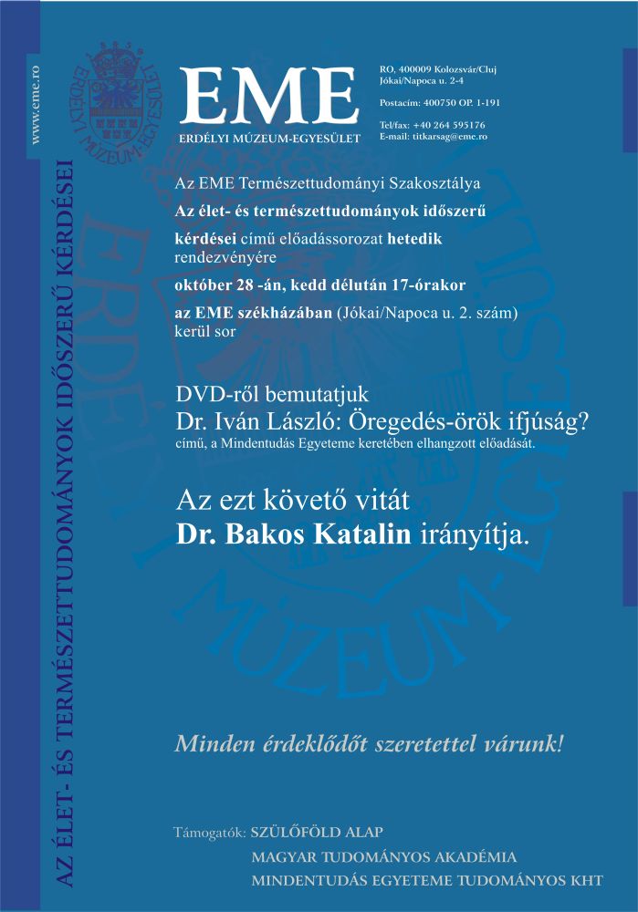 Az élet- és természettudományok időszerű kérdései című előadássorozat hetedik rendezvényére kerül sor az EME székházában (Jókai/Napoca u. 2. szám) október 28-án, kedd délután 17-órakor.