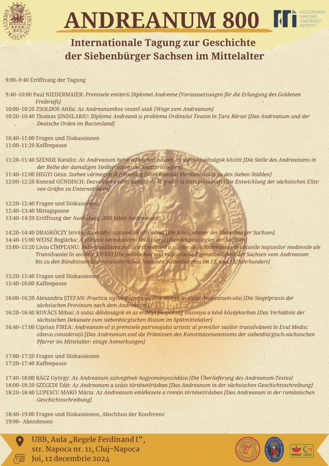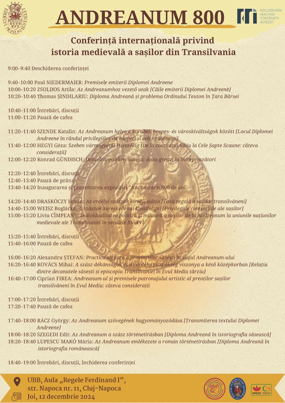 Az Erdélyi Múzeum-Egyesület Jakó Zsigmond Kutatóintézete (EME JZSKI) és a Babeș-Bolyai Tudományegyetem Történelem-Filozófia Karán működő Kolozsvári Magyar Történeti Intézet (KMTI) az erdélyi szászok 1224. évi kiváltságlevelének 800. évfordulója alkalmából nemzetközi konferenciát szervez neves szász, magyar és román történészek részvételével. Az előadók, többek között, az Andreanum keletkezésével, hagyományozódásával és emlékezetével kapcsolatos kérdéseket boncolgatnak, továbbá azt mutatják be, hogy annak egyes rendelkezései miként valósultak meg és fejlődtek tovább a szász közösség középkori története során, egészen a Szász Önkormányzat 1486. évi kiteljesedéséig.