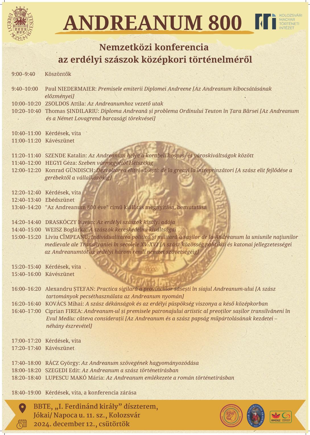 2024. december 12-én, 9 órai kezdettel sor került az Andreanum 800. Nemzetközi konferencia az erdélyi szászok középkori történelméről című rendezvényre, melyet az Erdélyi Múzeum Egyesület (EME) „Jakó Zsigmond” Kutatóintézete (JZSKI) szervezett a Babeș-Bolyai Tudományegyetem (BBTE) Magyar Történeti Intézetével (MTI) karöltve. A rendezvény felelősei az utóbbi intézmény részéről Lupescu Makó Mária egyetemi docens, az előbbi részéről pedig Hegyi Géza tudományos munkatárs voltak. Az eseménynek a BBTE I. Ferdinánd királyról elnevezett díszterme adott otthont az egyetem Jókai (Napoca) utcai épületében. A konferencia célja az volt, hogy méltó körülmények között, tudományos formában emlékezzen meg II. András magyar király 1224. évi kiváltságleveléről, az idén 800 éves Andreanumról, és módszeresen feltérképezze ennek hatását az erdélyi szász önkormányzat kiépítésének 1486-ig terjedő folyamatára.