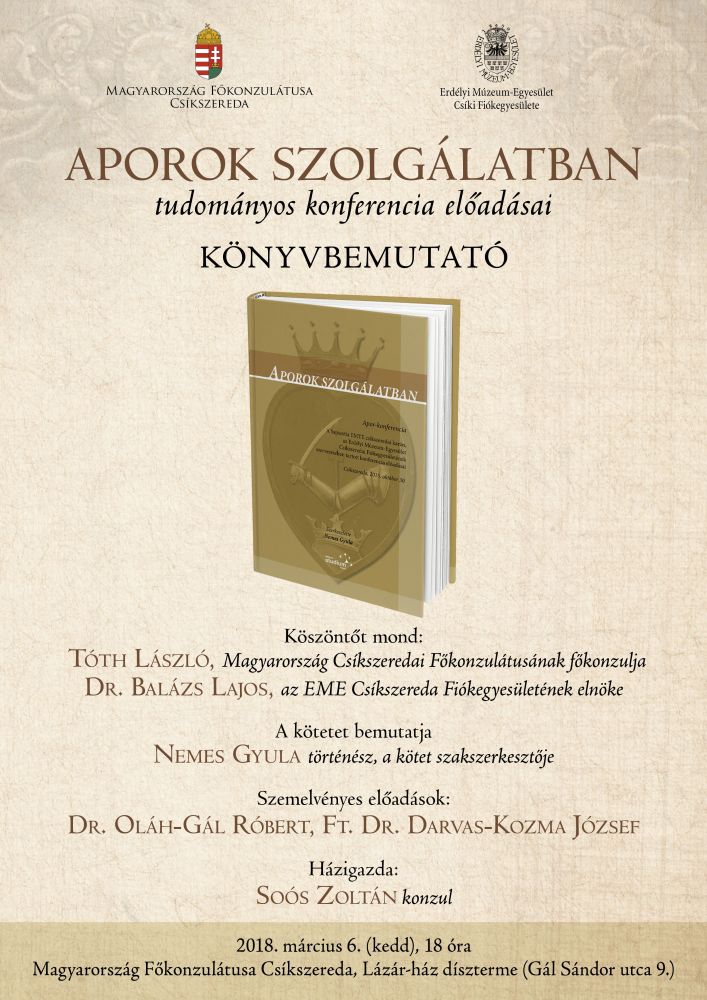 Magyarország Főkonzulátusa és az EME Csíkszeredai Fiókegyesülete tisztelettel meghívja "Aporok Szolgálatban. Apor-konferencia. A Sapientia EMTE Csíkszeredai karán az EME Csíkszeredai Fiókegyesületének szervezésében 2015. október 30-án tartott tudományos konferencia előadásai " című kötet bemutatójára.