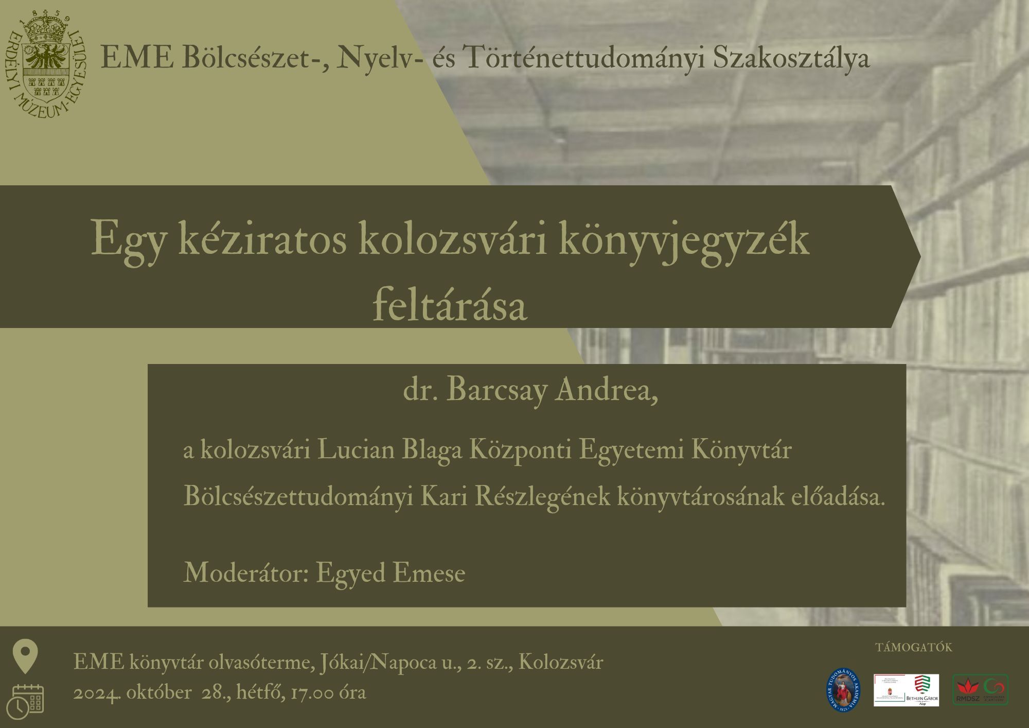 Egy kéziratos kolozsvári könyvjegyzék feltárása címmel tart előadást az EME Bölcsészet- Nelv- és Történettudományi Szakosztályában dr. Barcsay Andrea, a kolozsvári Lucian Blaga Központi Egyetemi Könyvtár Bölcsészettudományi Kari Részlegének könyvtárosa október 28-án, hétfőn 17 órától az EME könyvtári olvasótermében (Jókai/Napoca u. 2. sz., I. emelet). Moderátor: Egyed Emese.