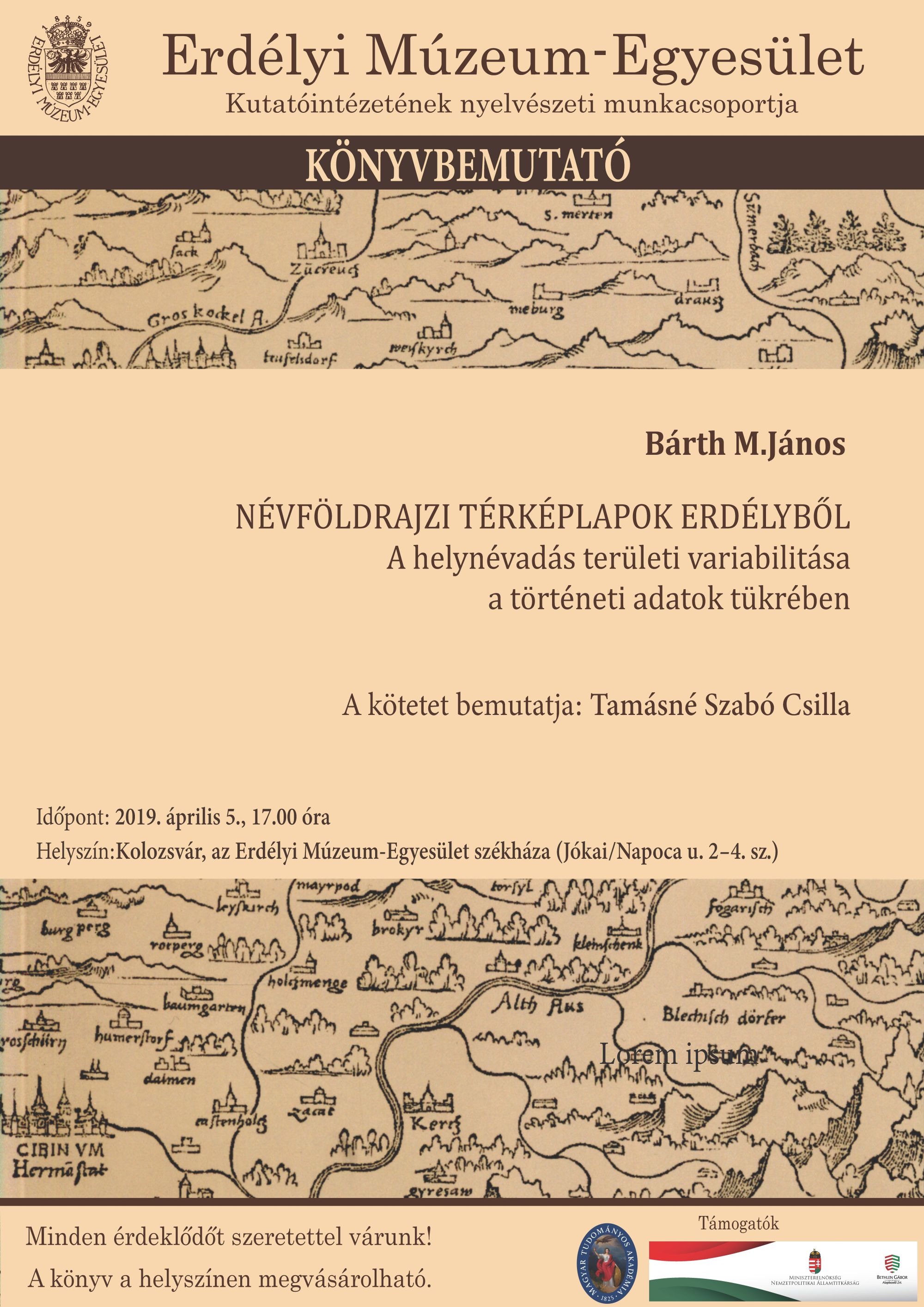 Helyszín: Kolozsvár, az Erdélyi Múzeum-Egyesület székháza (Jókai/Napoca u. 2-4. sz.)