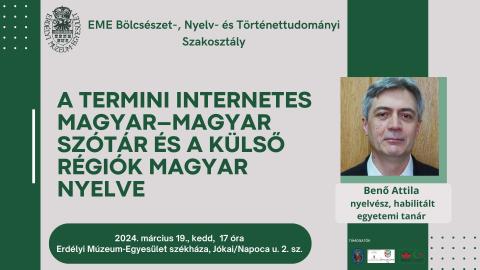 A Termini magyar–magyar szótárról tart előadást Benő Attila nyelvész, a BBTE Bölcsészettudományi Karának professzora, a Magyar és Általános Nyelvészeti Intézet tanszékvezetője 2024. március 19-én délután 17 órától az Erdélyi Múzeum-Egyesület székházában.
