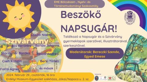 Találkozó a Napsugár és a Szivárvány gyermeklapok szerzőivel, illusztrátoraival, szerkesztőivel 2024 szökőnapján (február 29-én) 16 órától az EME Jókai/Napoca u. 2. sz. alatti székháza előadótermében. Moderátorok: Bereczki Szende, Egyed Emese. Szervező: az EME I. Bölcsészet-, Nyelv- és Történettudományi Szakosztálya.