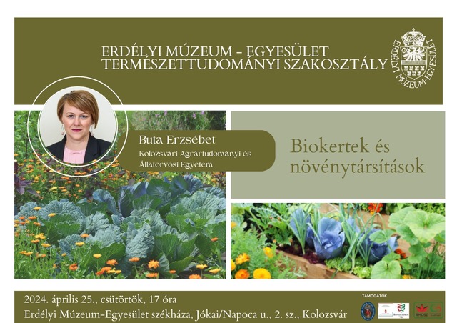 Dr. Buta Erzsébet, a kolozsvári Agrártudományi és Állatorvostudományi Egyetem oktatója és kutatója, tart elöadást "Biokertek és növénytársítások" címmel. Az előadás a napjainkban divatos biokultúrákról és biotermesztésről szól, arról, hogy hogyan lehet kis területeken, háztartási szerves hulladékok felhasználásával és pár növény segítségével zöld oázisokat varázsolni. Bizonyos tudományos megfigyelésekről is szó lesz, melyek szerint a növények a természetben társulásokat alkotnak, egyes fajok védik és fejlődésben segítik egymást, és ez az együttműködés a kultúrnövények között is lehetséges.