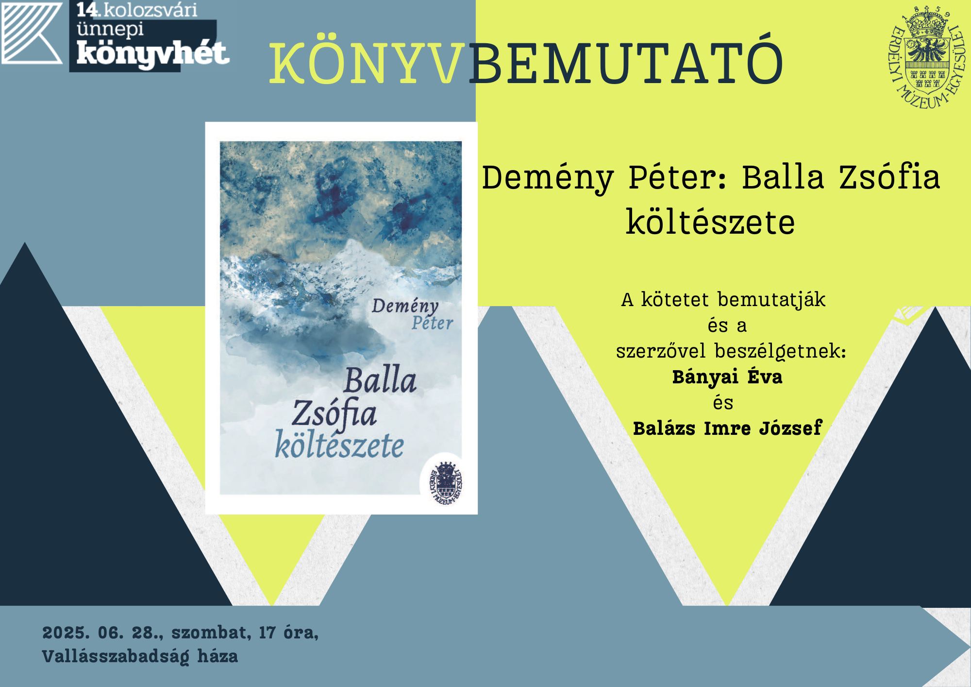 Az EME Kiadó szervezésében 2025. június 28-án, 17:00 órától a Vallásszabadság Házában kerül sor Demény Péter: „Balla Zsófia költészete” című kötet bemutatójára a Vallásszabadság Házában. A rendezvény a 14. Kolozsvári Ünnepi Könyvhét keretében valósul meg. A könyvet bemutatják, és a szerzővel beszélgetnek: Bányai Éva és Balázs Imre József.