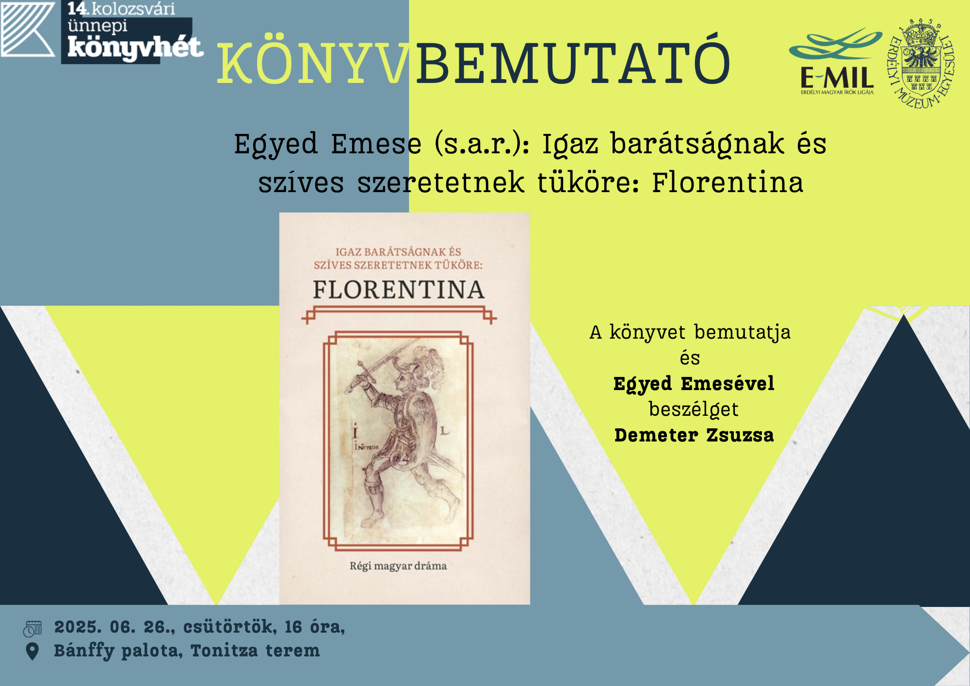 2025. június 26-án, csütörtökön 16 órától a kolozsvári Bánffy-palota Tonitza termében mutatják be Egyed Emese „Igaz barátságnak és szíves szeretetnek tüköre: Florentina” című kötetét. A szerzővel Demeter Zsuzsa beszélget.