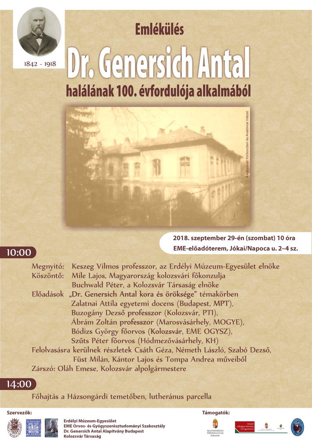 Az Erdélyi Múzeum-Egyesület, az EME Orvos- és Gyógyszerésztudományi Szakosztálya, a Dr. Genersich Antal Alapítvány Budapest valamint a Kolozsvár Társaság szeretettel meghívja Dr. Genersich Antal halálának 100. évfordulója alkalmából szervezett emlékülésre. Helyszín: az Erdélyi Múzeum–Egyesület Díszterme, Kolozsvár, Jókai (Napoca) utca 2–4. sz. Időpont: 2018. szeptember 29., szombat 10 óra