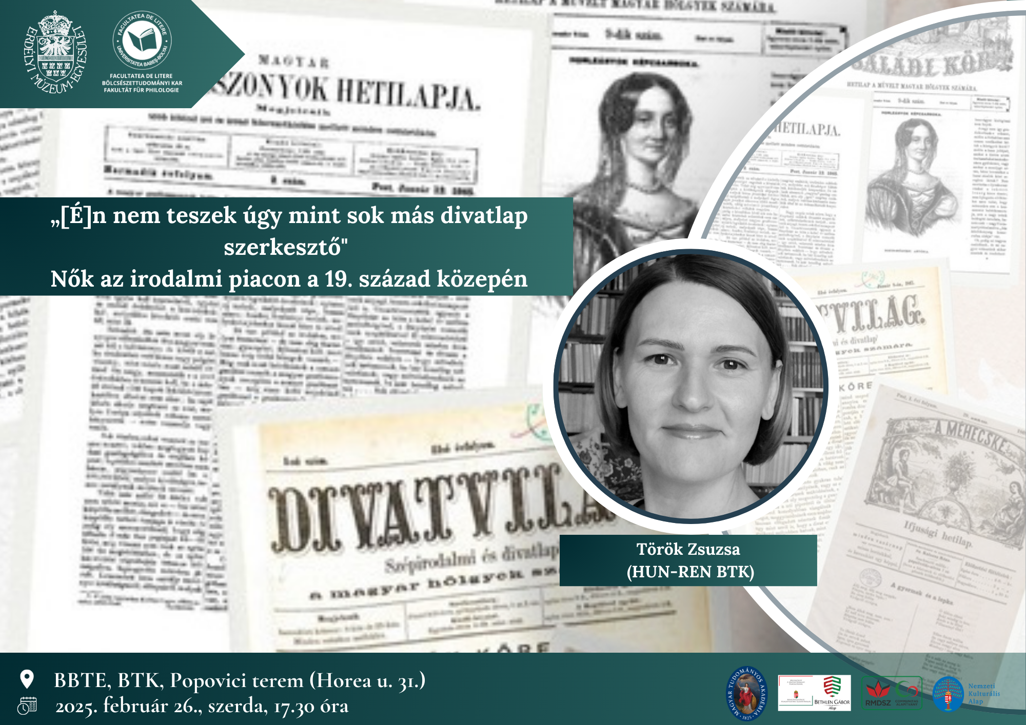 Török Zsuzsa a HUN-REN Bölcsészettudományi Kutatóközpont tudományos főmunkatársa, február 26-án ismét előadást tartott ott, ahol ő maga is tanulmányait végezte: a BBTE Bölcsészettudományi Karán. Legutóbb egy éve járt itt, amikor a periodikakutatás módszertanáról beszélt, a klasszmagyaros műhely egyik nyílt találkozóján. Már akkor is szó esett a női szerkesztőkről és ennek a területnek a kutatási lehetőségeiről, melybe most mélyebben is betekintést nyerhettek a hallgatók.