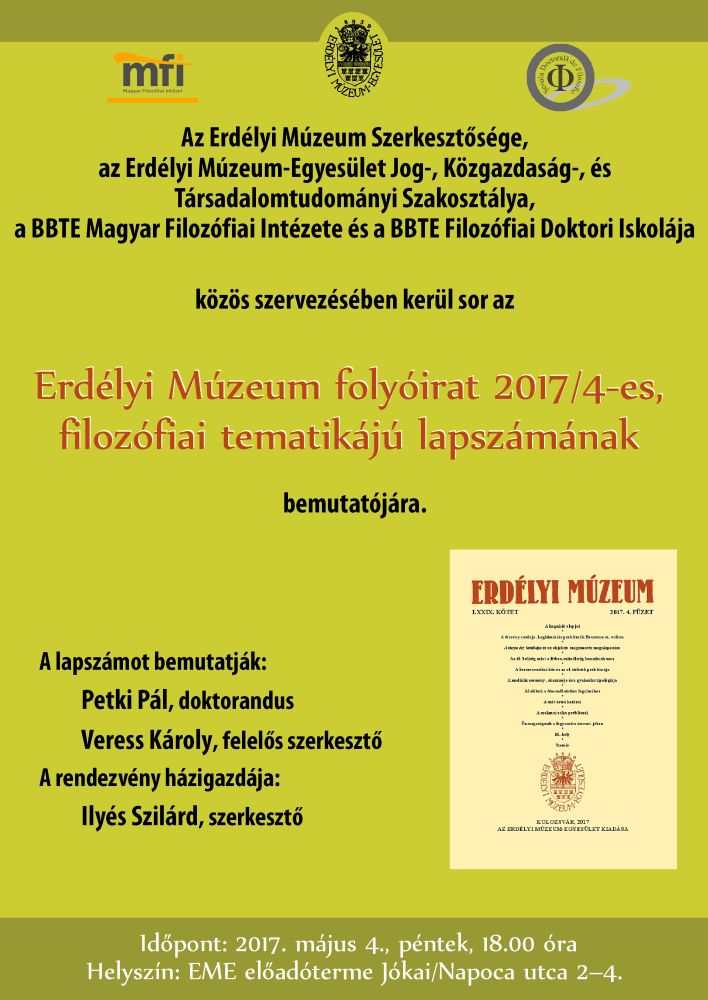 2018. május 4-én, pénteken délután 6 órától az EME székházában kerül sor az Erdélyi Múzeum 2017/4-es, filozófiai tematikájú lapszámának a bemutatójára. Az EME Jog-, Közgazdaság- és Társadalomtudományi Szakosztálya és az Erdélyi Múzeum szerkesztősége közös szervezésében sorra kerülő rendezvény vendégei Veress Károly, felelős szerkesztő és Petki Pál, doktorandus, a rendezvény házigazdája Ilyés Szilárd, szerkesztő.