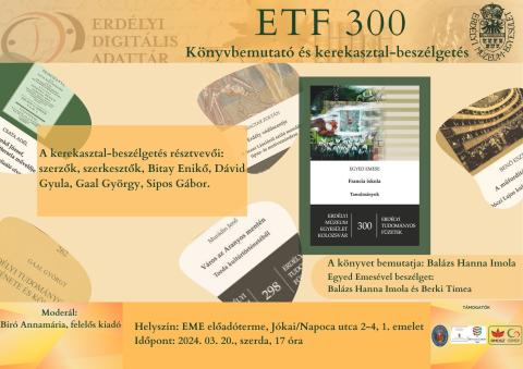 Az Erdélyi Múzeum-Egyesület Kiadója szeretettel meghívja 2024. március 20-án, szerdán 17 órára Egyed Emese: Francia iskola. Tanulmányok (ETF 300) című könyvének bemutatójára, és az azt követő beszélgetésre, melynek témája az Erdélyi Tudományos Füzetek sorozat története és jövője.