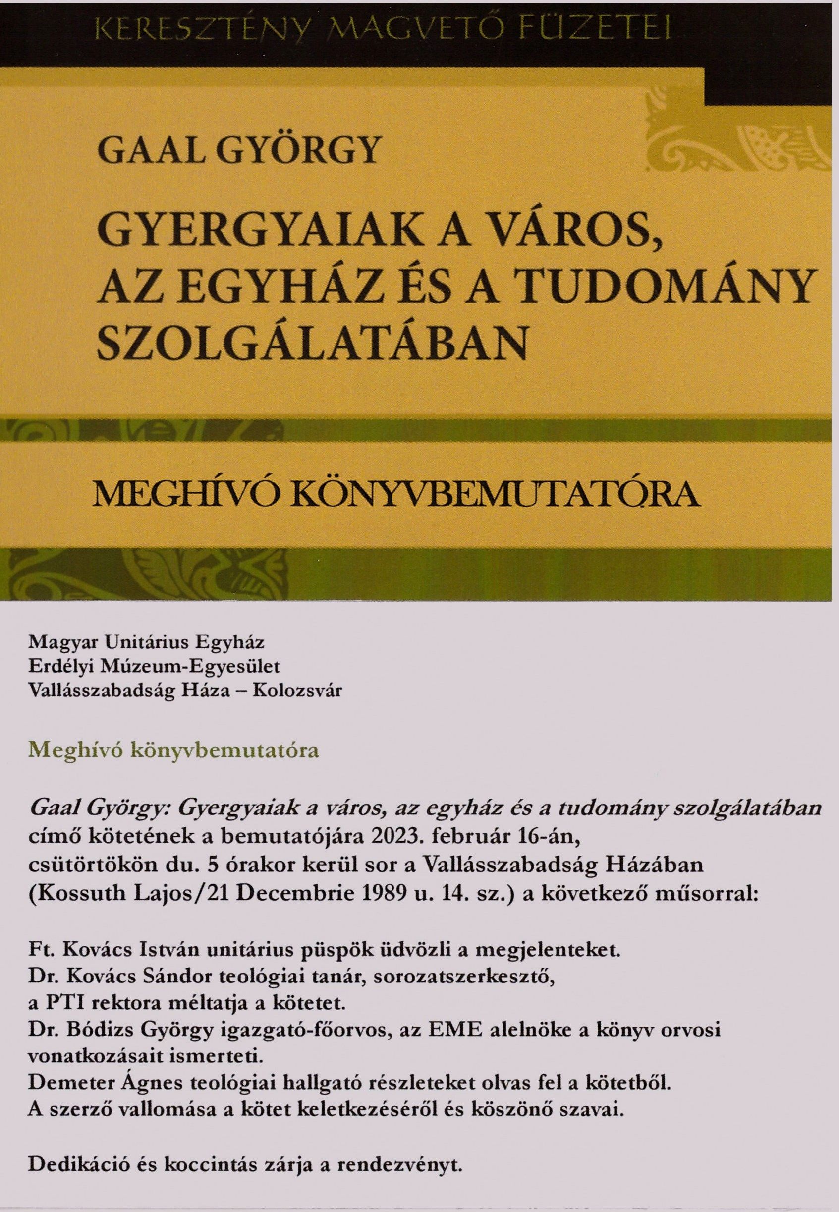 című kötetének a bemutatójára 2023. február 16-án, csütörtökön du. 5 órakor kerül sor a Vallásszabadság Házában (Kossuth Lajos/21 Decembrie 1989 u. 14. sz.) a következő műsorral: