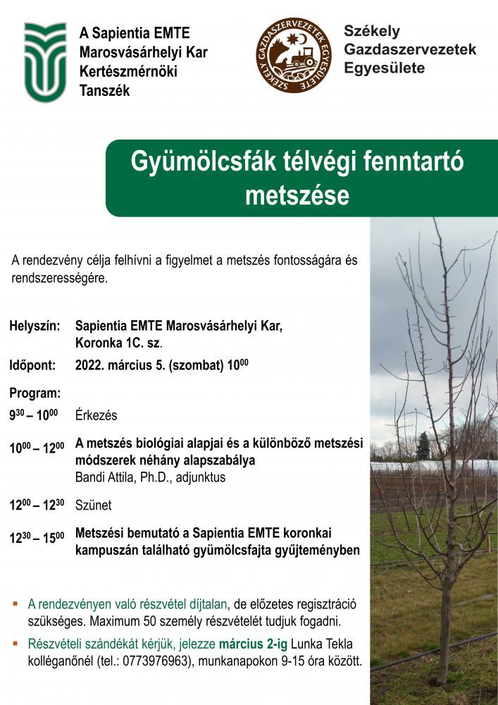 A Sapientia EMTE Marosvásárhelyi Karának Kertészmérnöki Tanszéke, a Székely Gazdaszervezetek Egyesülete és az EME Agrártudományi Szakosztály közreműködésével 2022. március 5-én, szombaton 10 órai kezdettel metszési bemutatót szervez Gyümölcsfák télvégi fenntartó metszése címmel.