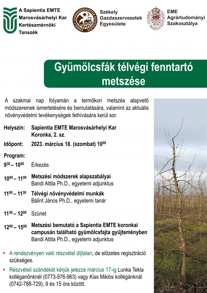 A Sapientia EMTE Marosvásárhelyi Karának Kertészmérnöki Tanszéke, a Székely Gazdaszervezetek Egyesülete és az EME Agrártudományi Szakosztály közreműködésével 2023. március 18-án, szombaton 10 órai kezdettel metszési bemutatót szervez Gyümölcsfák télvégi fenntartó metszése címmel a C07-es teremben, mely során a termőkori metszés alapvető módszereinek ismertetésére és bemutatására, valamint az aktuális növényvédelmi tevékenységek felhívására kerül sor.