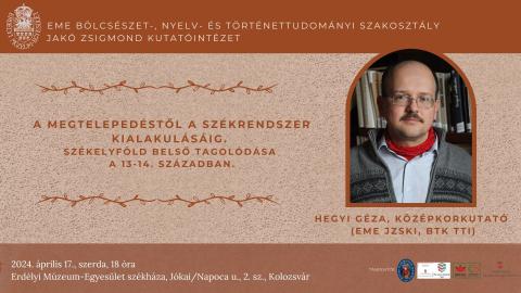 Az EME I. Szakosztálya és a "Jakó Zsigmond" Kutatóintézet (JZSKI) szervezésében Hegyi Géza történetkutató, a JZSKI és a Bölcsészettudományi Kutatóközpont Történettudományi Intézetének a munkatársa tart előadást az EME székházának előadótermében 2024. április 17-én, szerdán, 18 órától az alábbi témáról: A megtelepedéstől a székrendszer kialakulásáig. Székelyföld belső tagolódása a 13-14. században.