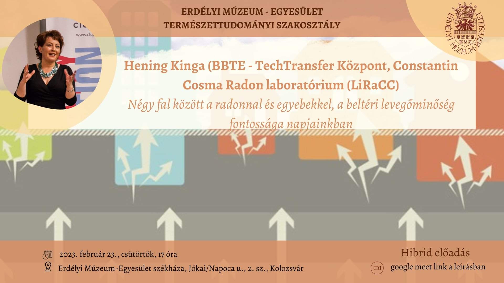 Havi előadó ülését tartja az EME Természettudományi Szakosztálya 2023. február 23-án, csütörtökön délután 17 órától az Erdélyi Múzeum-Egyesület székházában. Dr. Hening Kinga fizikus, BBTE - TechTransfer Központ, Constantin Cosma Radon laboratórium (LiRaCC) tart előadást " Négy fal között a radonnal és egyebekkel, a beltéri levegőminőség fontossága napjainkban" címmel.