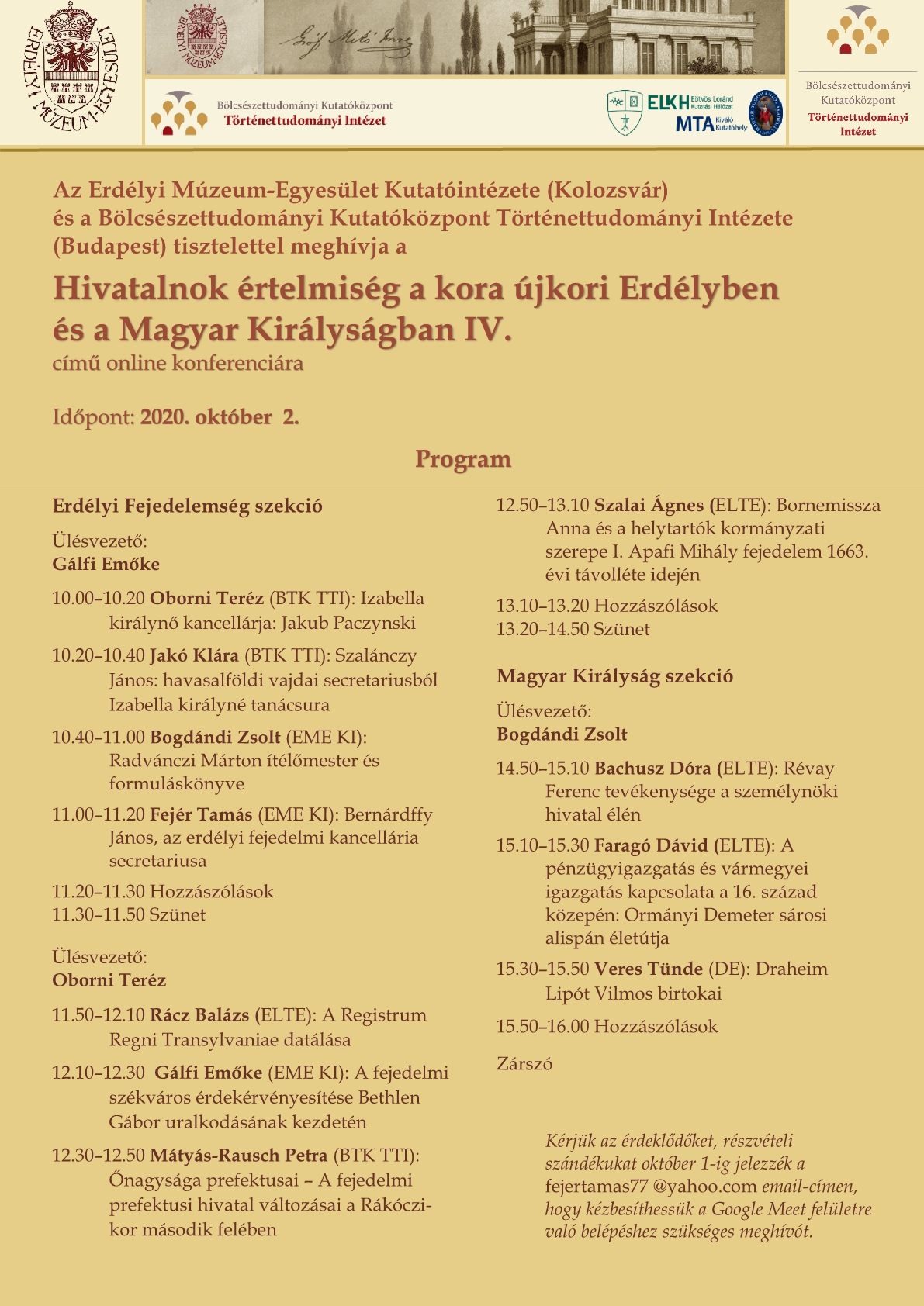 Az Erdélyi Múzeum-Egyesület Kutatóintézete és a Bölcsészettudományi Kutatóközpont Történettudományi Intézete közös rendezvényeként került sor 2020. október 2-án a Hivatalnok értelmiség a kora újkori Erdélyben és a Magyar Királyságban IV. című online konferenciára. Az Intézetünk és a Történettudományi Intézet között 2013-ban intézményesült együttműködési kapcsolatok eredményeként először 2015-ben Kolozsváron megrendezett műhelykonferencia konferenciasorozattá alakult, a harmadik ülésszaktól pedig kiterjesztette érdeklődési körét Erdély mellett a Magyar Királyság hivatalnokrétegére is. Ezúttal az online tanácskozáson bemutatott 11 előadás zöme kora újkori erdélyi hivatalnok pályákat vagy hivatalokat mutatott be, a királyságbeli intézményeket, illetve az azokat működtető személyeket három előadás vizsgálta. Az előadók között az EME Kutatóintézetének munkatársai (Bogdándi Zsolt, Fejér Tamás, Gálfi Emőke) mellett, a BTK Történettudományi Intézetének több kutatója (Jakó Klára, Mátyás-Rausch Petra, Oborni Teréz), továbbá az ELTE és a Debreceni Egyetem doktoranduszai (Bachusz Dóra, Faragó Dávid, Rácz Balázs és Veres Tünde) szerepeltek. Az előadásokat és az ezt követő vitát nagyszámú erdélyi és magyarországi érdeklődő követte.