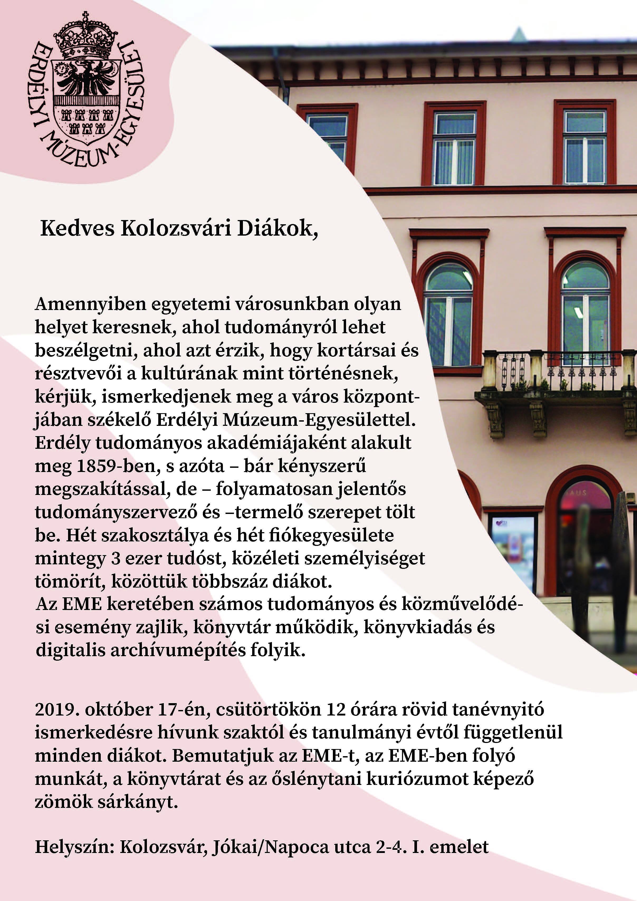 Amennyiben egyetemi városunkban olyan helyet keresnek, ahol tudományról lehet beszélgetni, ahol azt érzik, hogy kortársai és résztvevői a kultúrának mint történésnek, kérjük, ismerkedjenek meg a város központjában székelő Erdélyi Múzeum-Egyesülettel.