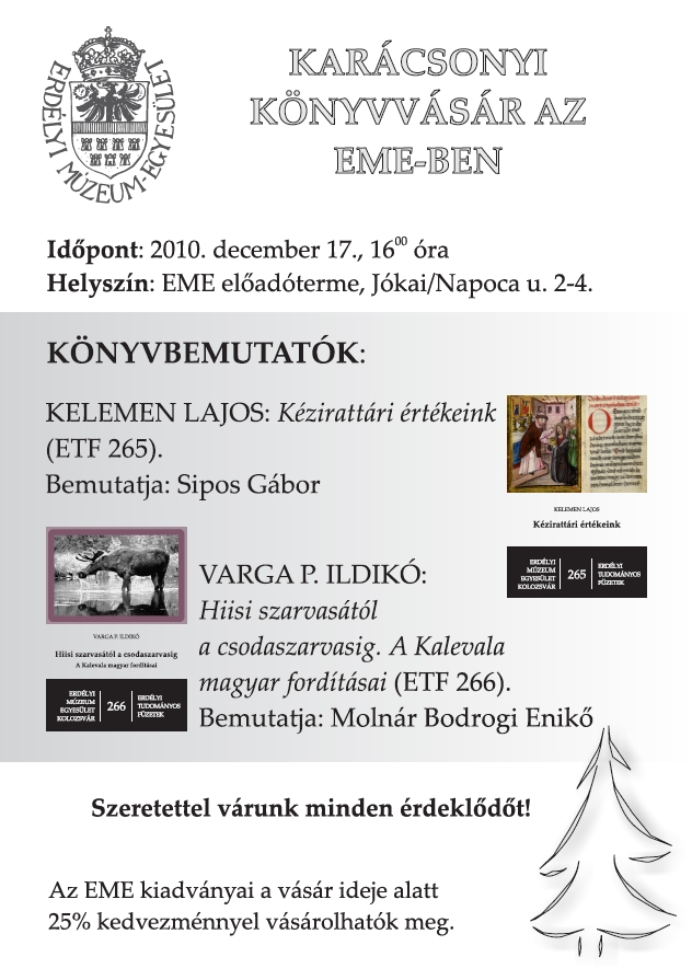 Az Erdélyi-Múzeum Egyesület munkatársai az idei évben is szeretnének olvasóikkal együtt ünnepelni. Ezért a karácsony közeledtével újra megrendezzük a könyvbemutatókkal egybekötött könyvvásárt.