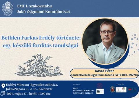 Az EME I. szakosztálya, a Jakó Zsigmond Kutatóintézet és a BBTE Magyar Történeti Intézete meghívására dr. habil. Kasza Péter tanszékvezető egyetemi docens tart előadást Bethlen Farkas Erdély története: egy készülő fordítás tanulságai címmel.