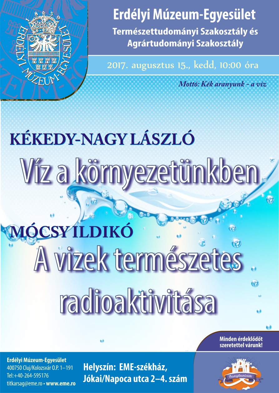 Az EME Természettudományi Szakosztály és Agrártudományi Szakosztály meghívására Kékedy-Nagy László tart előadást "Víz a környezetünkben" címmel.