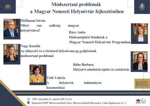 A Magyar Nemzeti Helynévtár Programról tartanak konferenciát a MNHP Irányító Testületének tagjai december 8-án, péntek 12 órától a Sapientia EMTE Marosvásárhelyi Karán. A konferencia célja az MNHP ismertetése, közelítése a társtudományokhoz, valamint a munka során felmerülő módszertani problémák megvitatása
