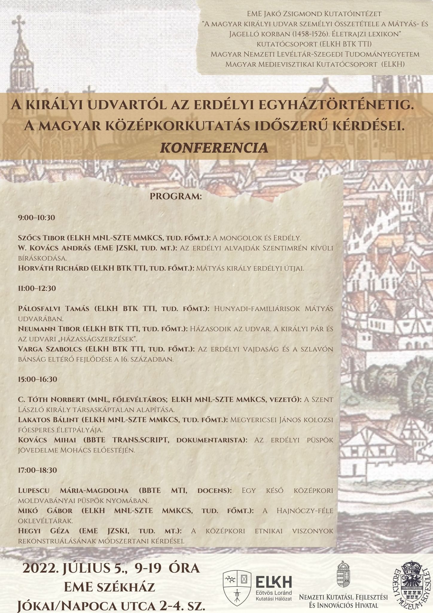 2022. július 5-én, 9 órai kezdettel, középkorász konferenciára kerül sor Kolozsvárott, az Erdélyi Múzeum Egyesület (EME) központi épületének előadótermében. A rendezvényen a korszak nyolc magyarországi és négy erdélyi kutatója ad elő saját aktuális érdeklődési területéhez kapcsolódó témából, ezáltal is reprezentatív képet nyújtva a magyar medievisztika középgenerációjának időszerű kutatási irányvonalairól.
