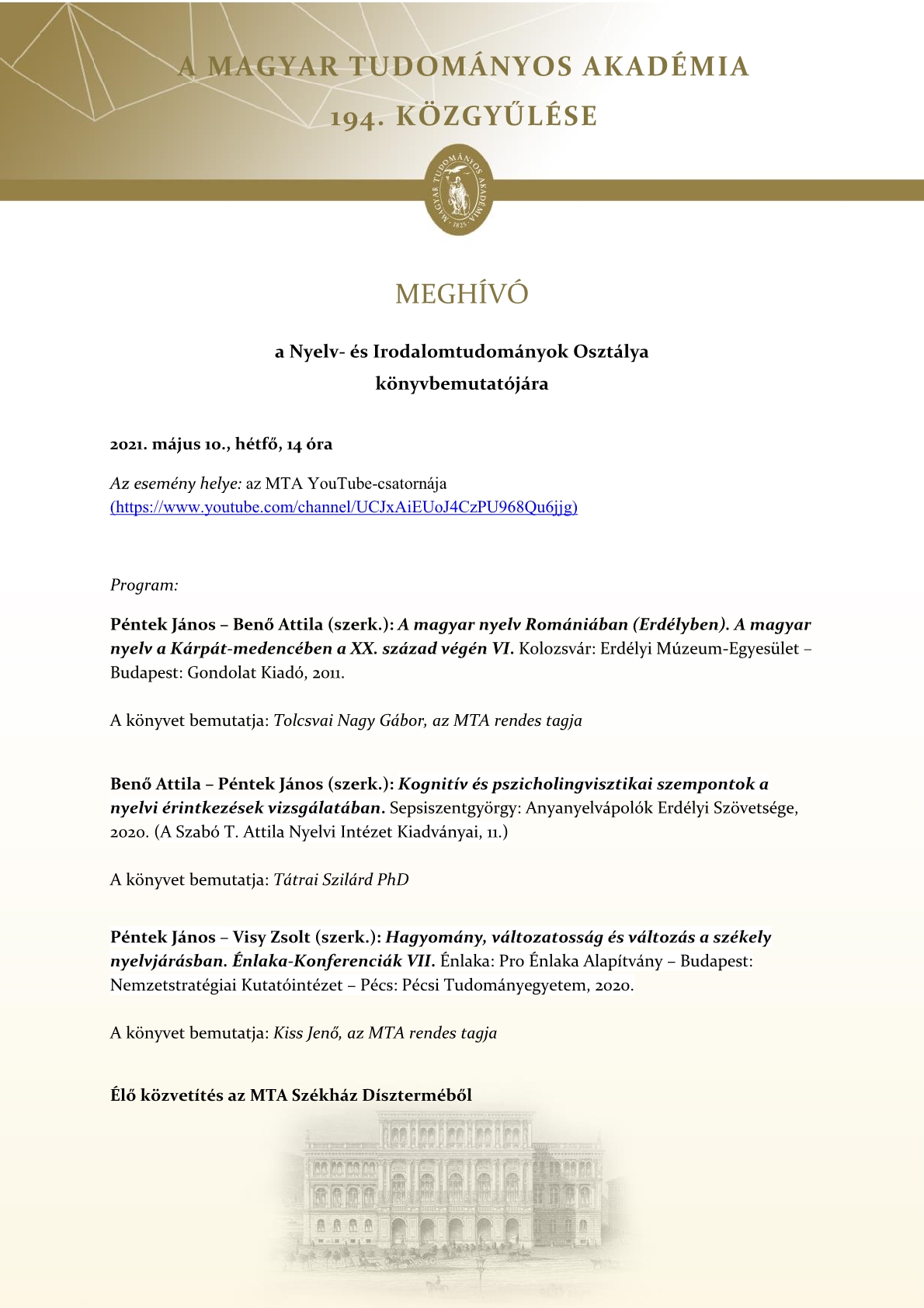 Az esemény helye: az MTA YouTube-csatornája (https://www.youtube.com/channel/UCJxAiEUoJ4CzPU968Qu6jjg )