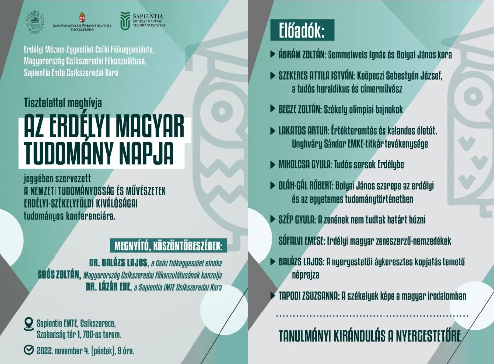 Erdélyi Múzem-Egyesület Csíki Fiókegyesülete, Magyarország Csíkszeredai Főkonzulátusa, a Sapientia EMTE Csíkszeredai Kara tisztelettel meghívja az Erdélyi Magyar Tudomány Napja jegyében szervezett A NEMZETI TUDOMÁNYOSSÁG ÉS MŰVÉSZETEK ERDÉLYI-SZÉKELYFÖLDI KIVÁLÓSÁGAI tudományos konferenciára.