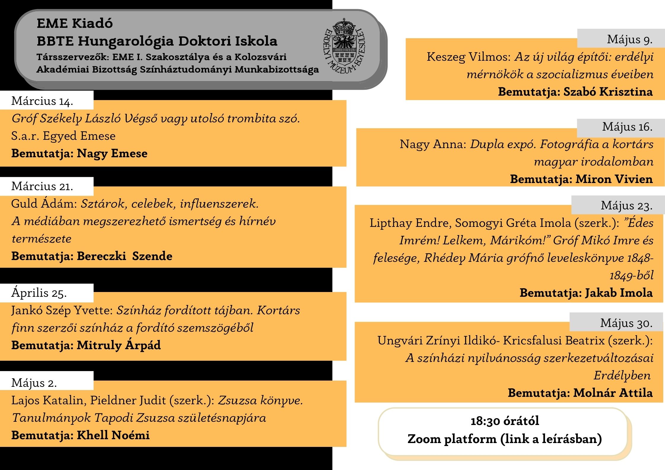 A BBTE Hungarológiai Tanulmányok Doktori Iskola és az Erdélyi Múzeum-Egyesület Kiadója közös könyvbemutatókat szervez a Textológia tantárgy keretein belül hétfőnként 18.30 órától.