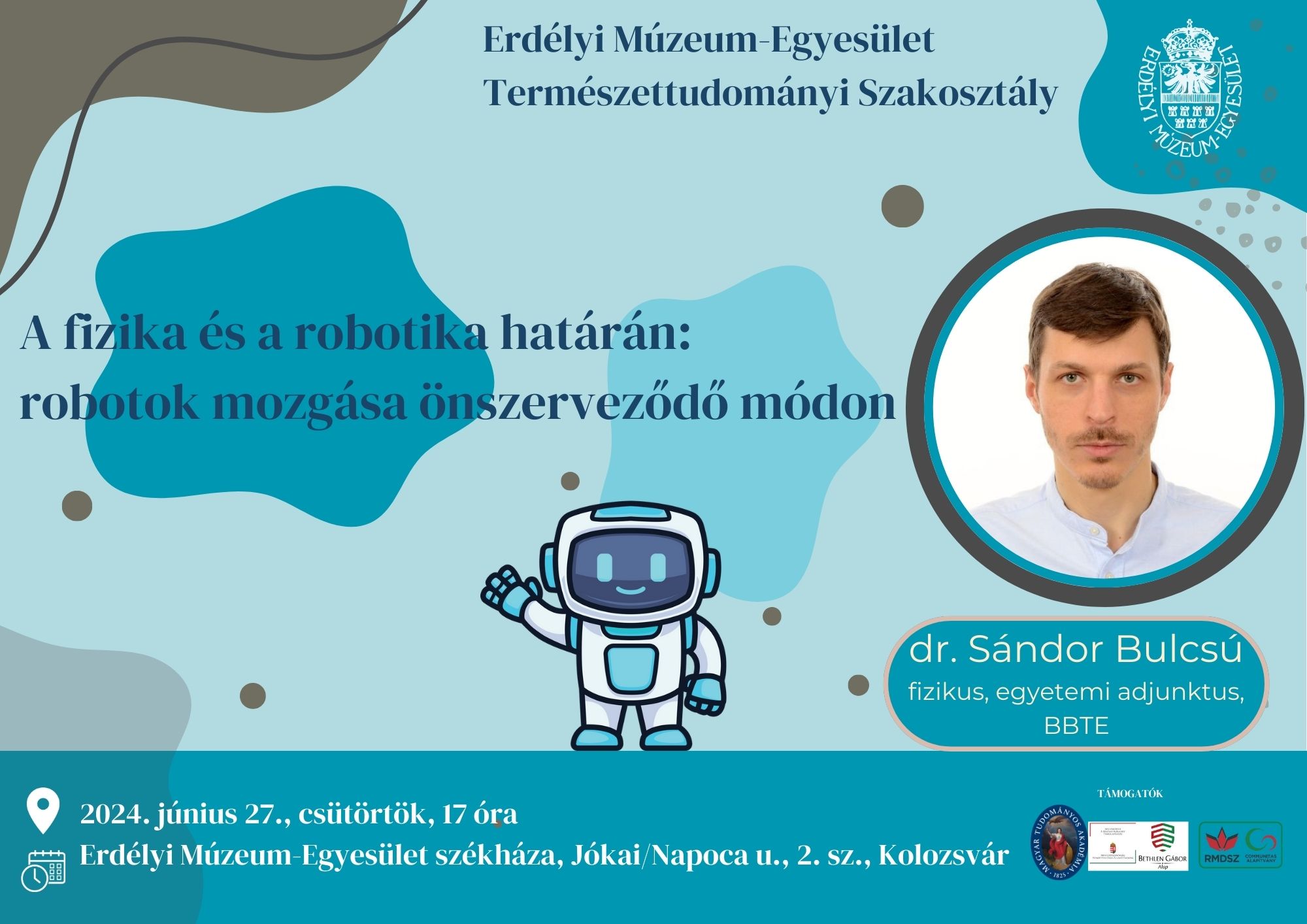 Meghívottunk Sándor Bulcsú fizikus, egyetemi adjunktus, Babeș–Bolyai Tudományegyetem, Fizika Kar, Kolozsvár, előadásának címe A fizika és a robotika határán: robotok mozgása önszerveződő módon.