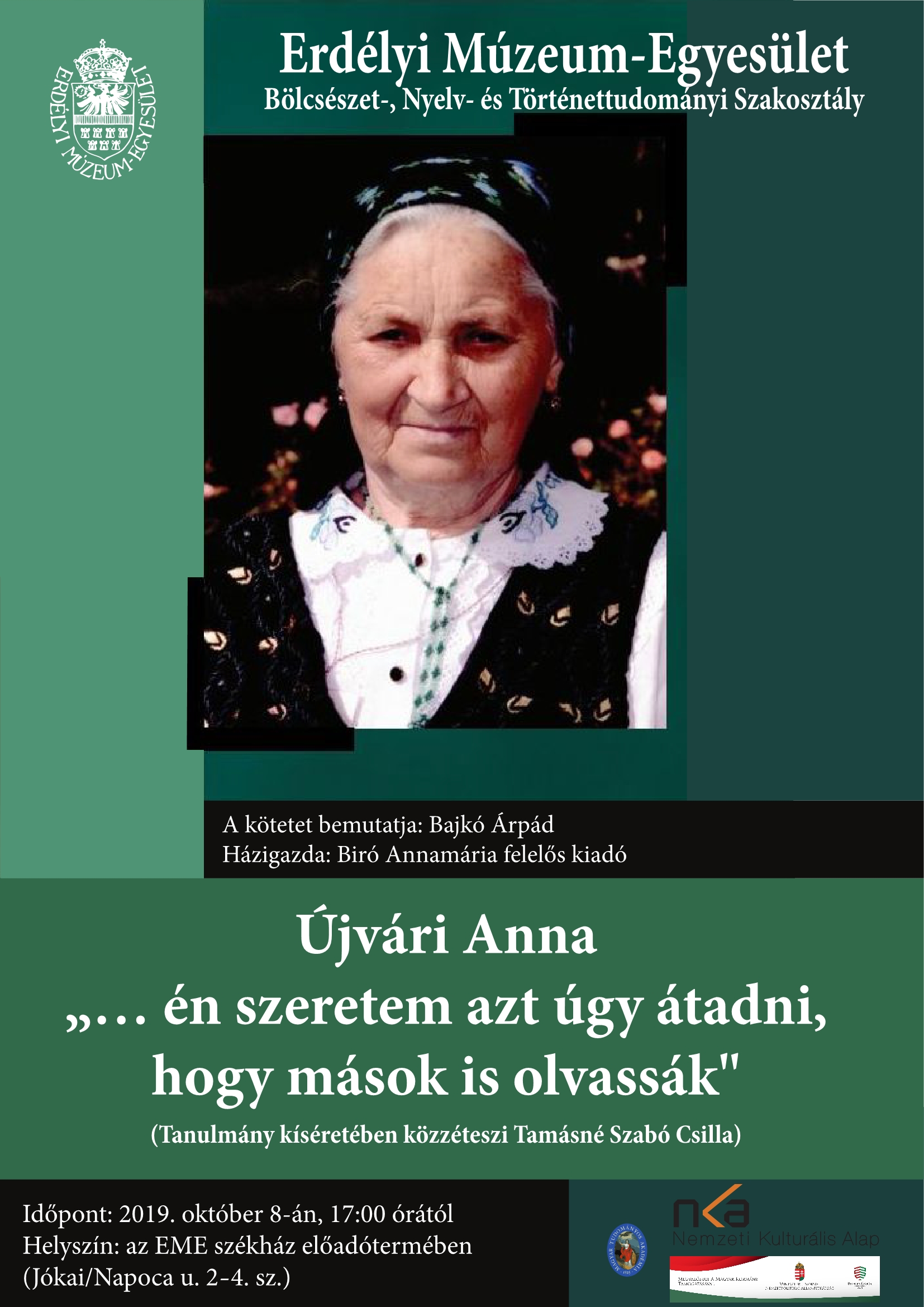 Az Erdélyi Múzeum-Egyesület Bölcsészet-, Nyelv- és Történettudományi Szakosztálya tisztelettel meghívja Újvári Anna „… én szeretem azt úgy átadni, hogy mások is olvassák" (Tanulmány kíséretében közzéteszi Tamásné Szabó Csilla) című kötetének bemutatójára, melyet 2019. október 8-án, kedden, 17 órától tartunk az EME székházának előadótermében.