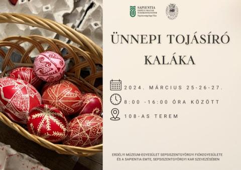 Az Erdélyi Múzeum-Egyesület Sepsiszentgyörgyi Fiókegyesülete és a Sapientia EMTE, Sepsiszentgyörgyi Kara tojásíró ünnepi kalákát szervez a Sapientia sepsiszentgyörgyi oktatási helyszínén a Sapientiás kollégák, hallgatók, valamint az EME tagok számára.
