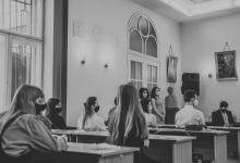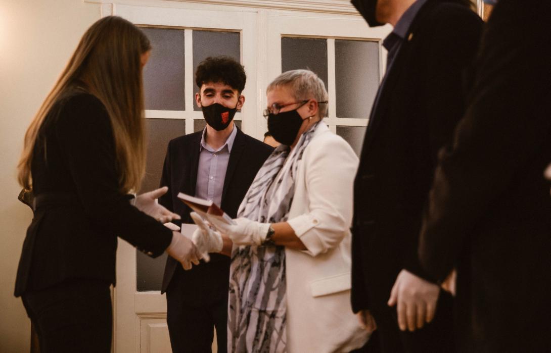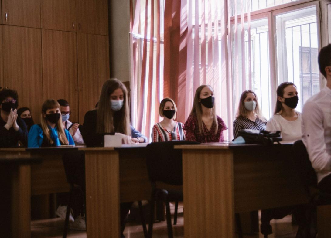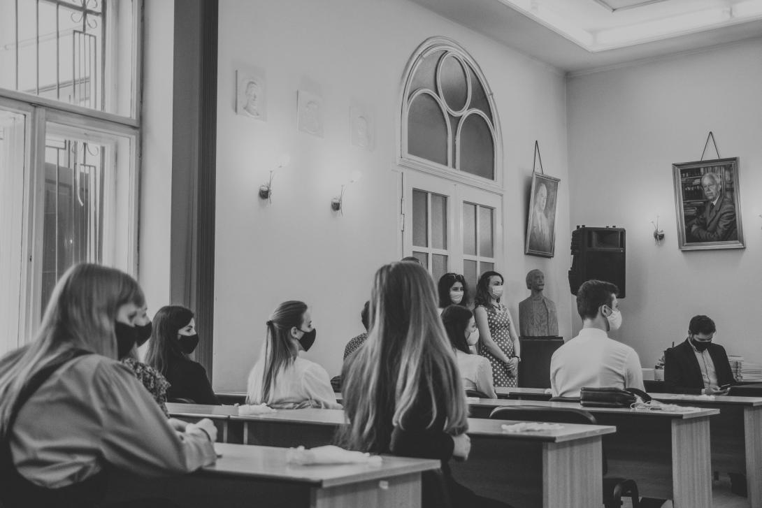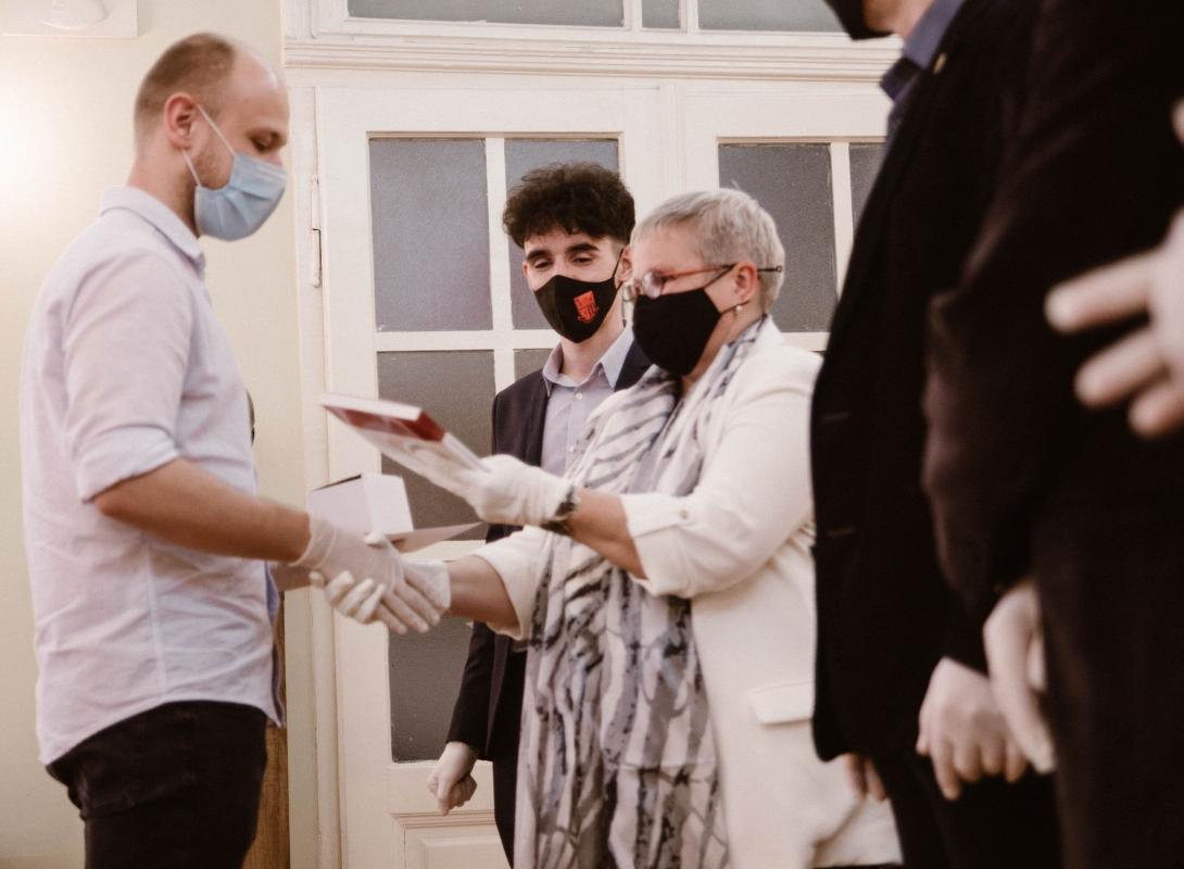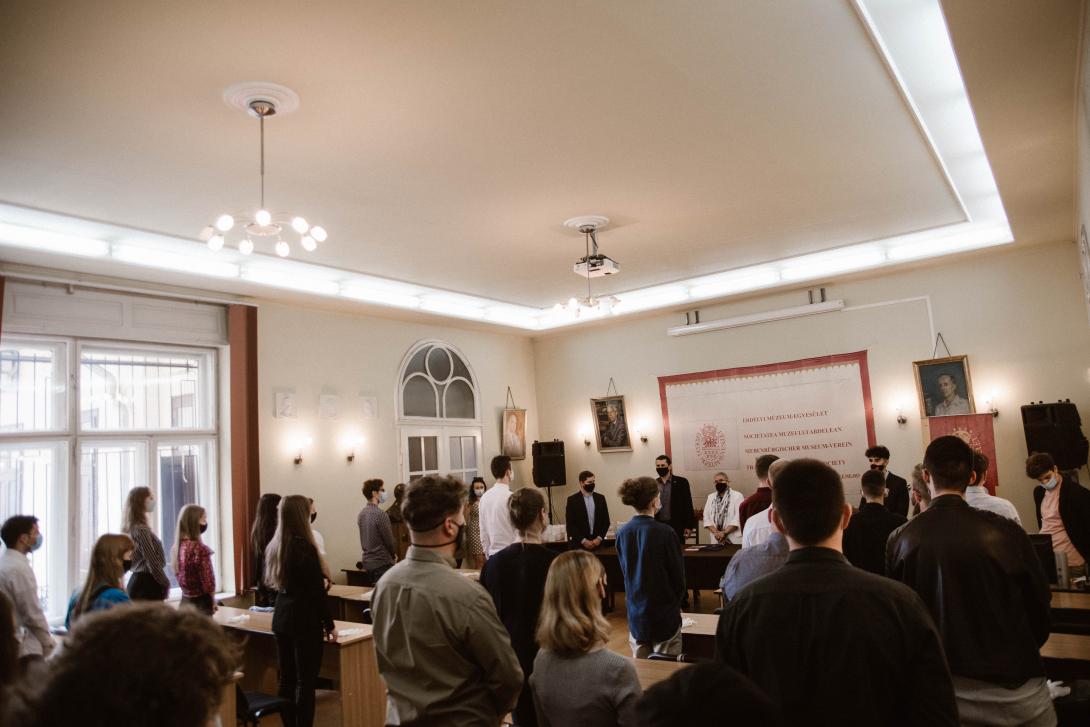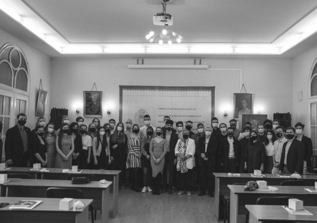 Maszkos ballagó diákok az EME előadótermében, Kolozsvárt 2021. június 1-én