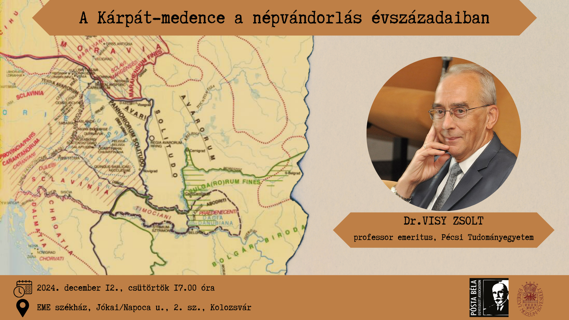 A Pósta Béla Egyesület és az Erdélyi Múzeum-Egyesület meghívására Visy Zsolt a Pécsi Tudományegyetem professzor emeritusa tart előadást A Kárpát-medence a népvándorlás évszázadaiban címmel.