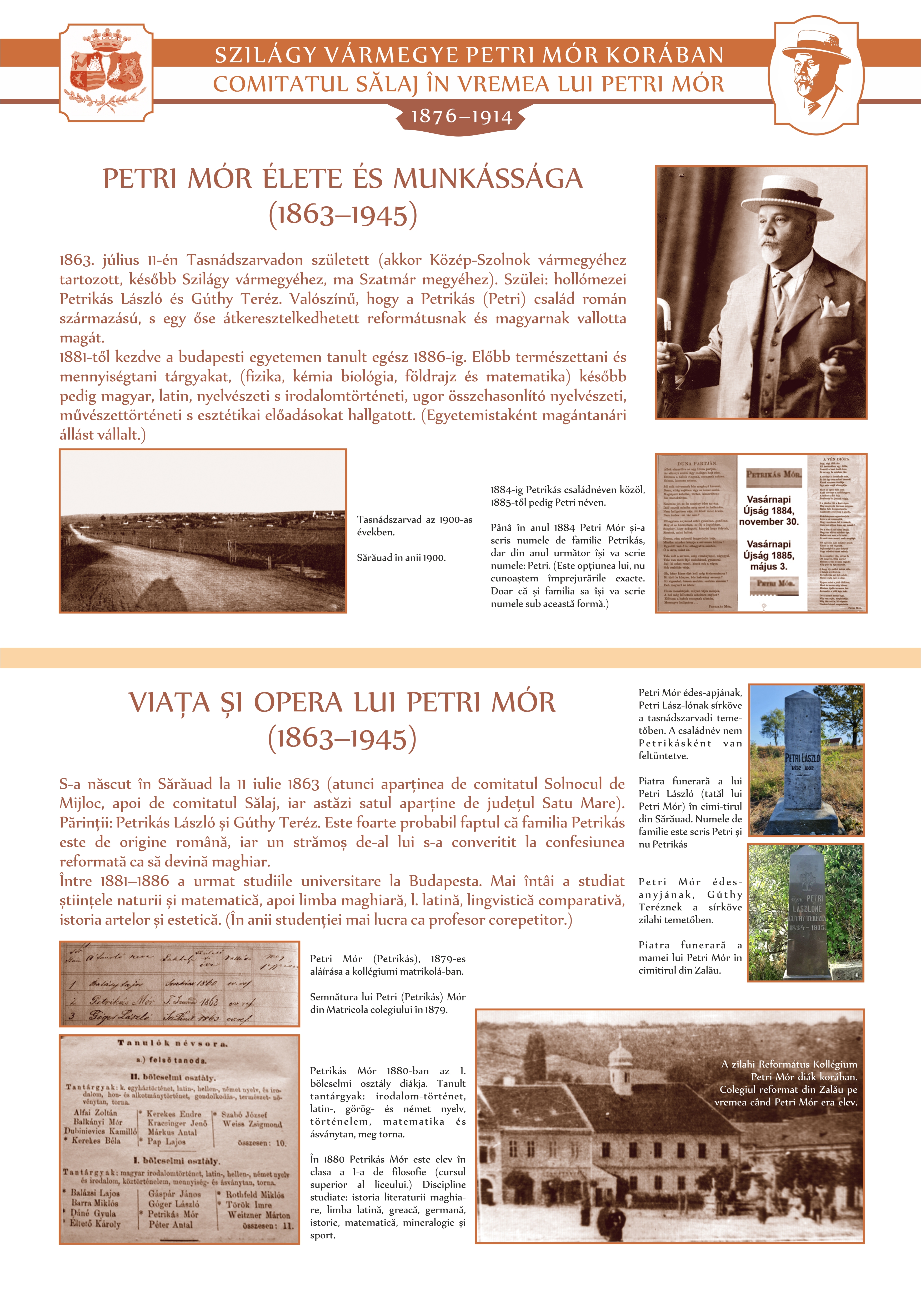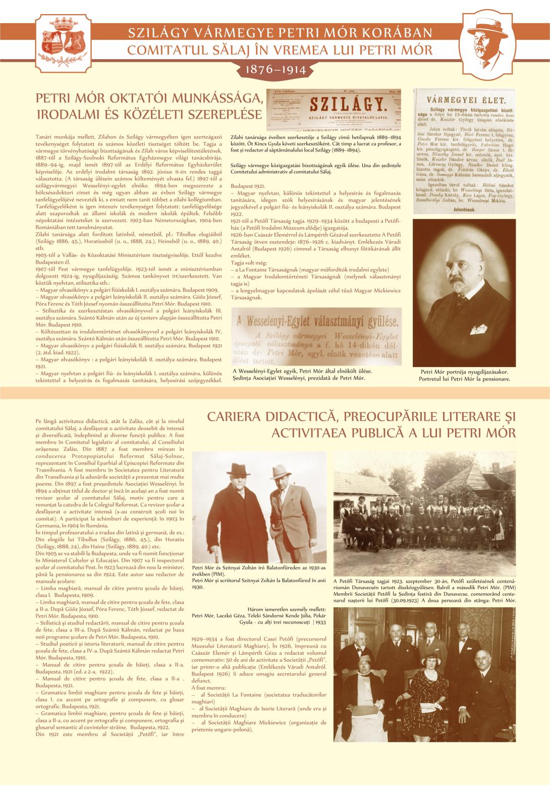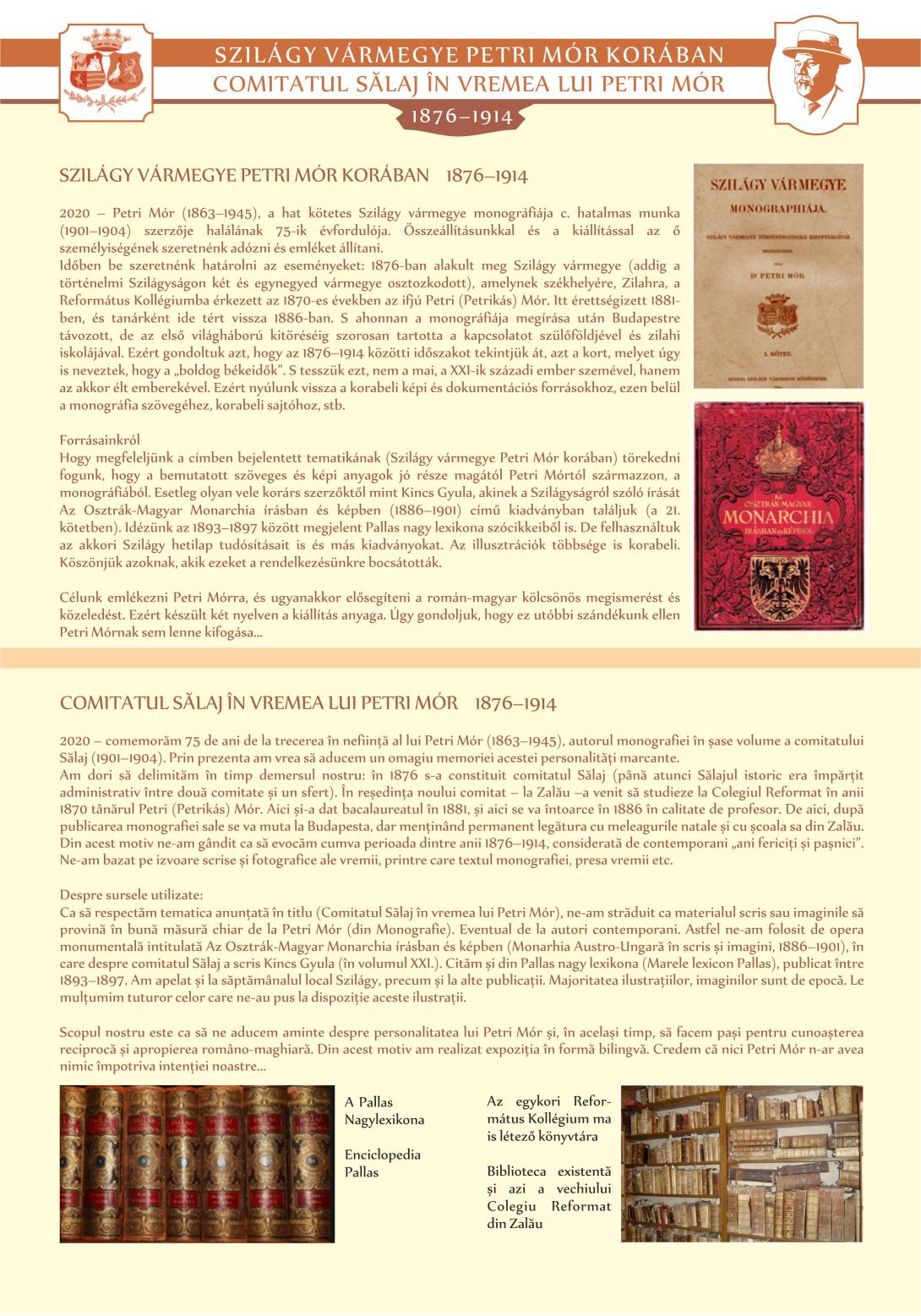 Eredetileg a rendezvényt 2020. május 9-re terveztük, ezt viszont a járványhezet felülírta, így le is mondtunk róla. A szilágysági közönség esetében az on-line előadások nem használhatók így, hosszas töprengés után egy poszter-kiállítás megvalósítása mellet döntöttünk, Szilágy vármegye Petri Mór korában címmel. Az eredetileg 20 posztert képzeltünk el, de az adat- és képmennyiség végül is 35 posztert eredményezett. A kiállítás bemutatja Petri Mór életét és munkásságát, majd pedig részletesen Szilágy vármegye állapotát, fejlődését létrejöttétől, 1876-től az első világháborúig.