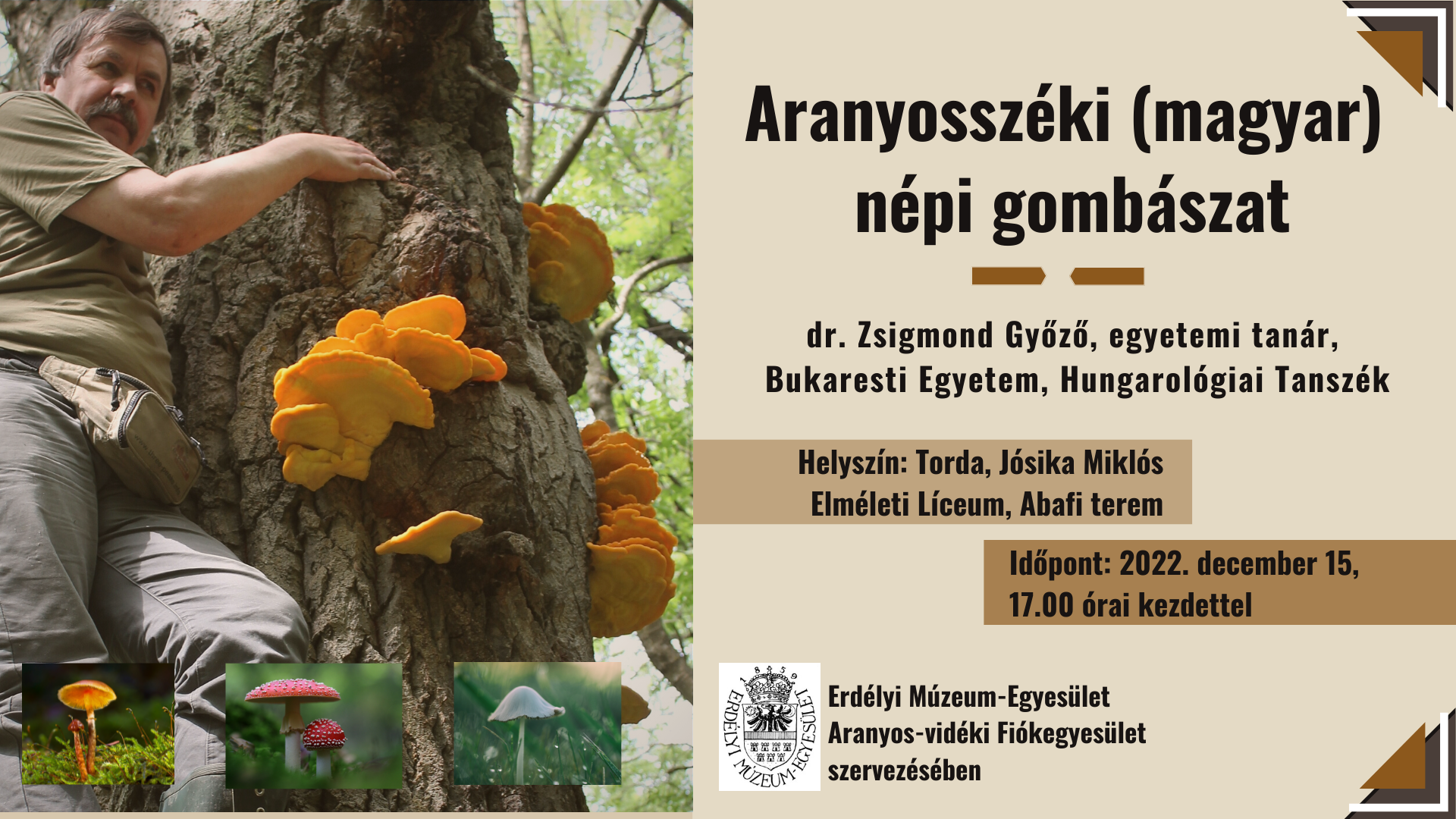 Az Erdélyi Múzeum-Egyesület Aranyos-vidéki Fiókegyesülete meghívására 2022. december 15-én, csütörtökön 17.00 órától dr. Zsigmond Győző, egyetemi tanár, (Bukaresti Egyetem, Hungarológiai Tanszék) tart előadást  Aranyosszéki (magyar) népi gombászat címmel. A rendezvény helyszíne: Torda, Jósika Miklós Elméleti Líceum, Abafi terem