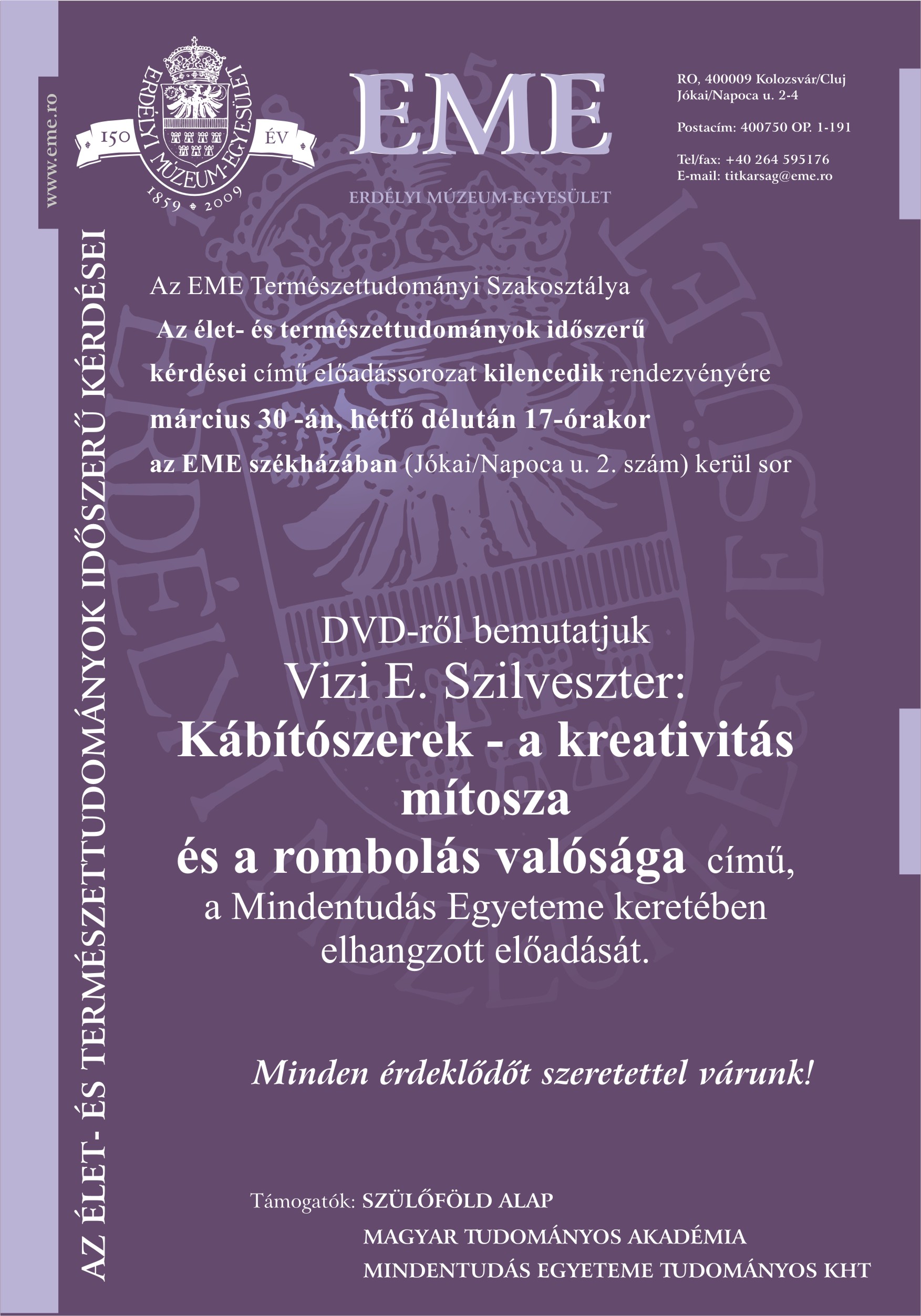 március 30-an hétfőn délutan 17-órakor az EME székházban (Jókai/Napoca u. 2. sz)