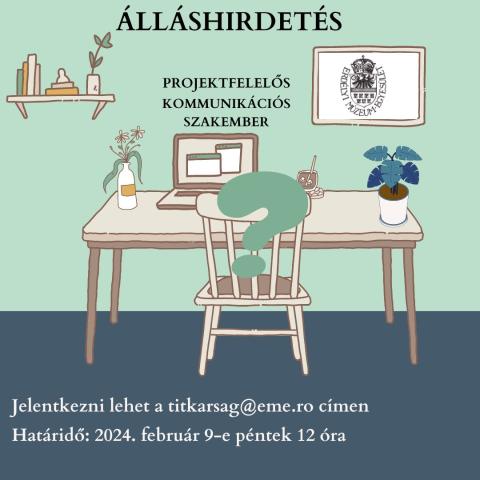 Jelentkezni a titkarsag@eme.ro címen lehet 2024. február 9-e péntek 12 óráig. Kérjük, az e-mail tárgyában tüntesse fel a munkakör megnevezését.