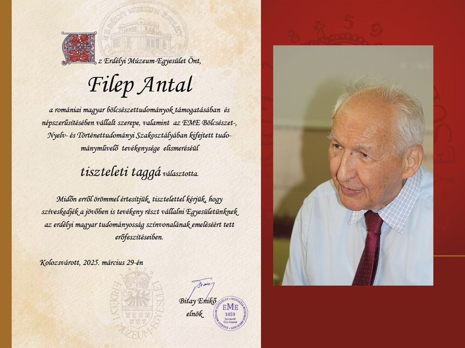 A Erdélyi Múzeum-Egyesület Választmánya Filep Antalt a romániai magyar bölcsészettudományok támogatásában és népszerűsítésében vállalt szerepe, valamint az EME Bölcsészet-, Nyelv- és Történettudományi Szakosztályában kifejtett tudományművelő tevékenysége elismeréséül tiszteleti taggá választotta.